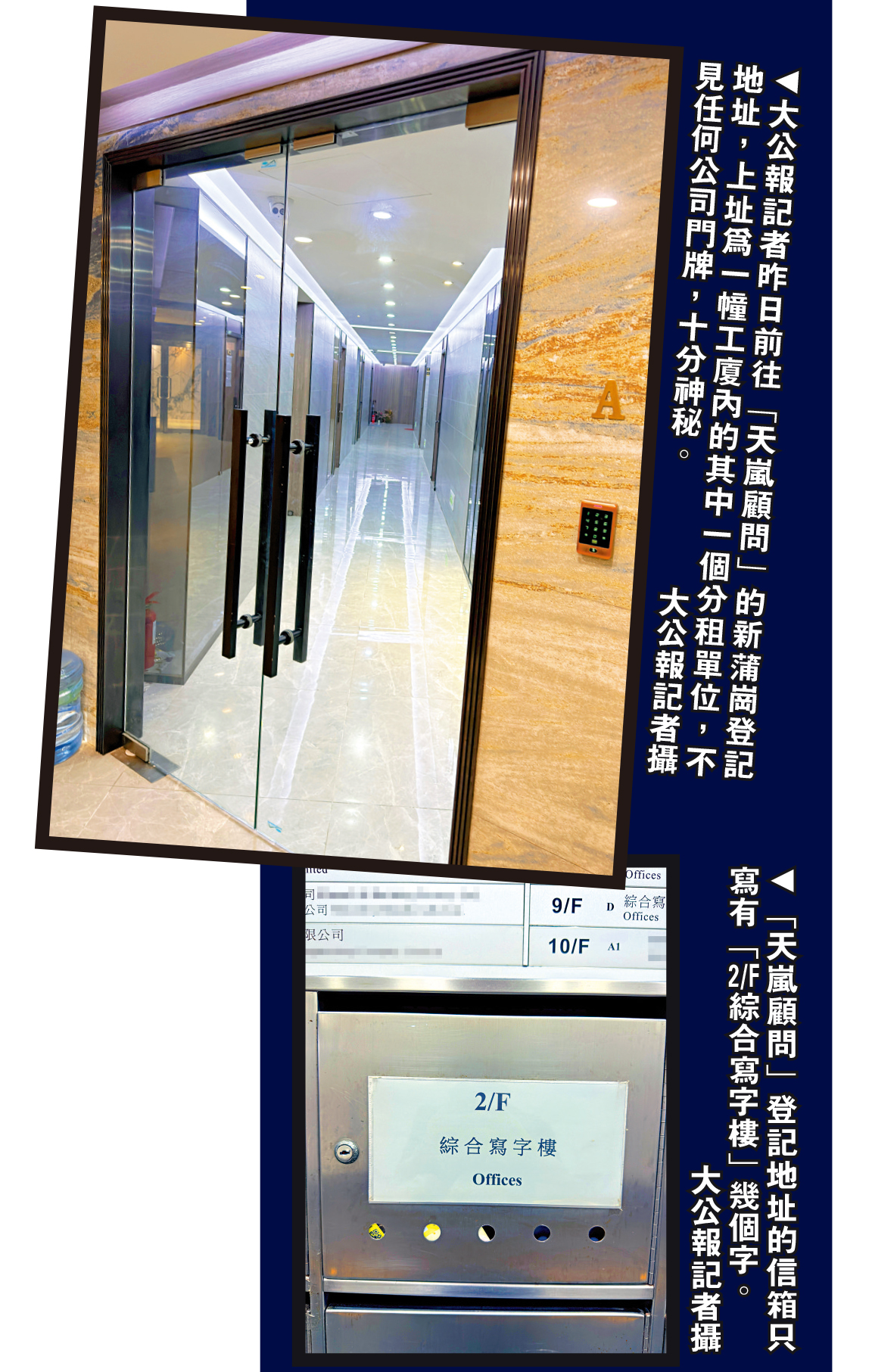大公報記者昨日前往位於新蒲崗「天嵐建築及測量顧問有限公司」,該公司商業登記地址為一幢工廈內綜合寫字樓的其中一個分租單位,但不見任何公司門牌。記者致電公司查詢,接聽的員工表示「老闆人正在外遊,下周才回港」,對於廉政公署調查對方稱不便回答,然後匆匆掛線。
