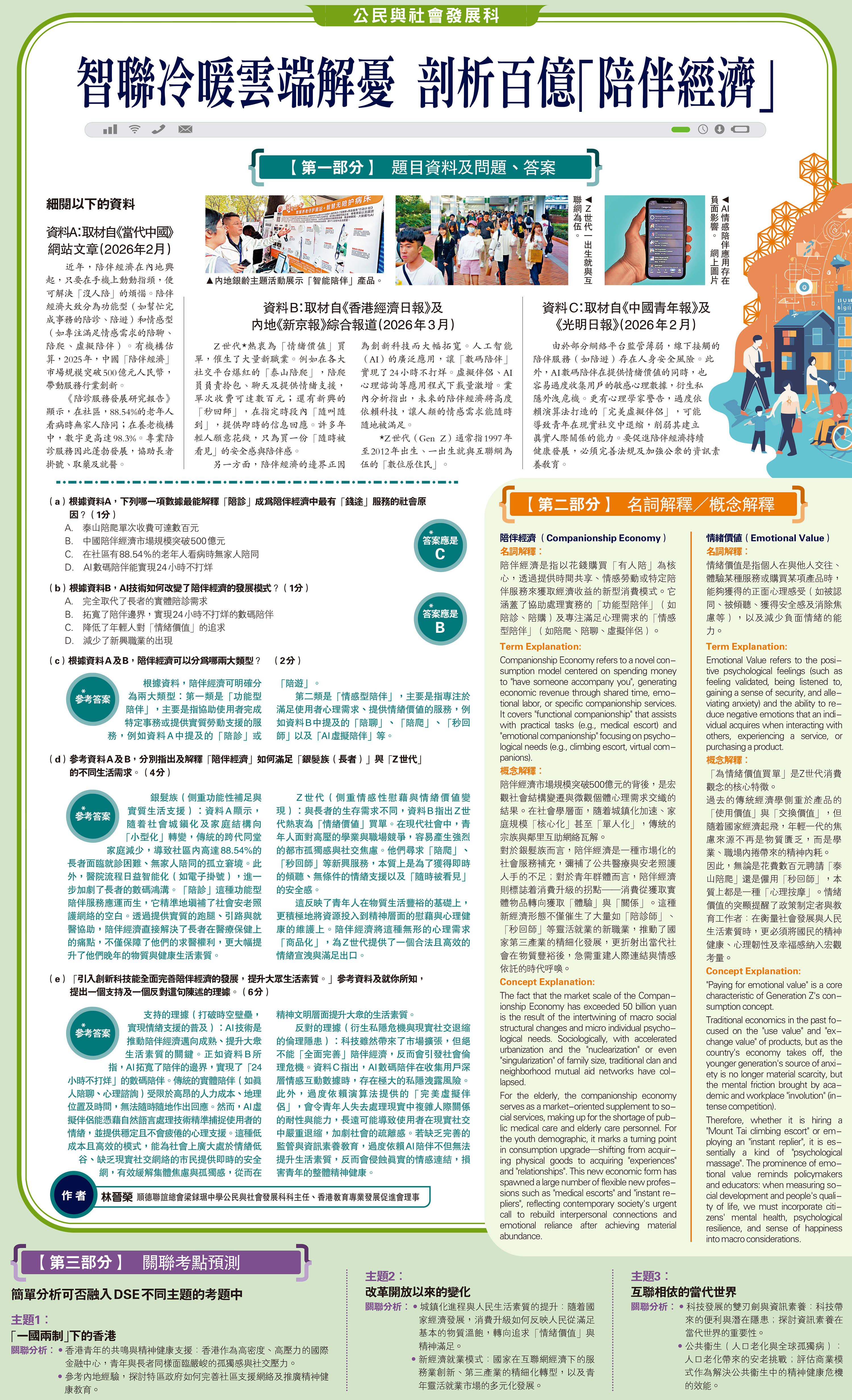 (d)參考資料A及B,分別指出及解釋「陪伴經濟」如何滿足「銀髮族(長者)」與「Z世代」的不同生活需求。(4分)