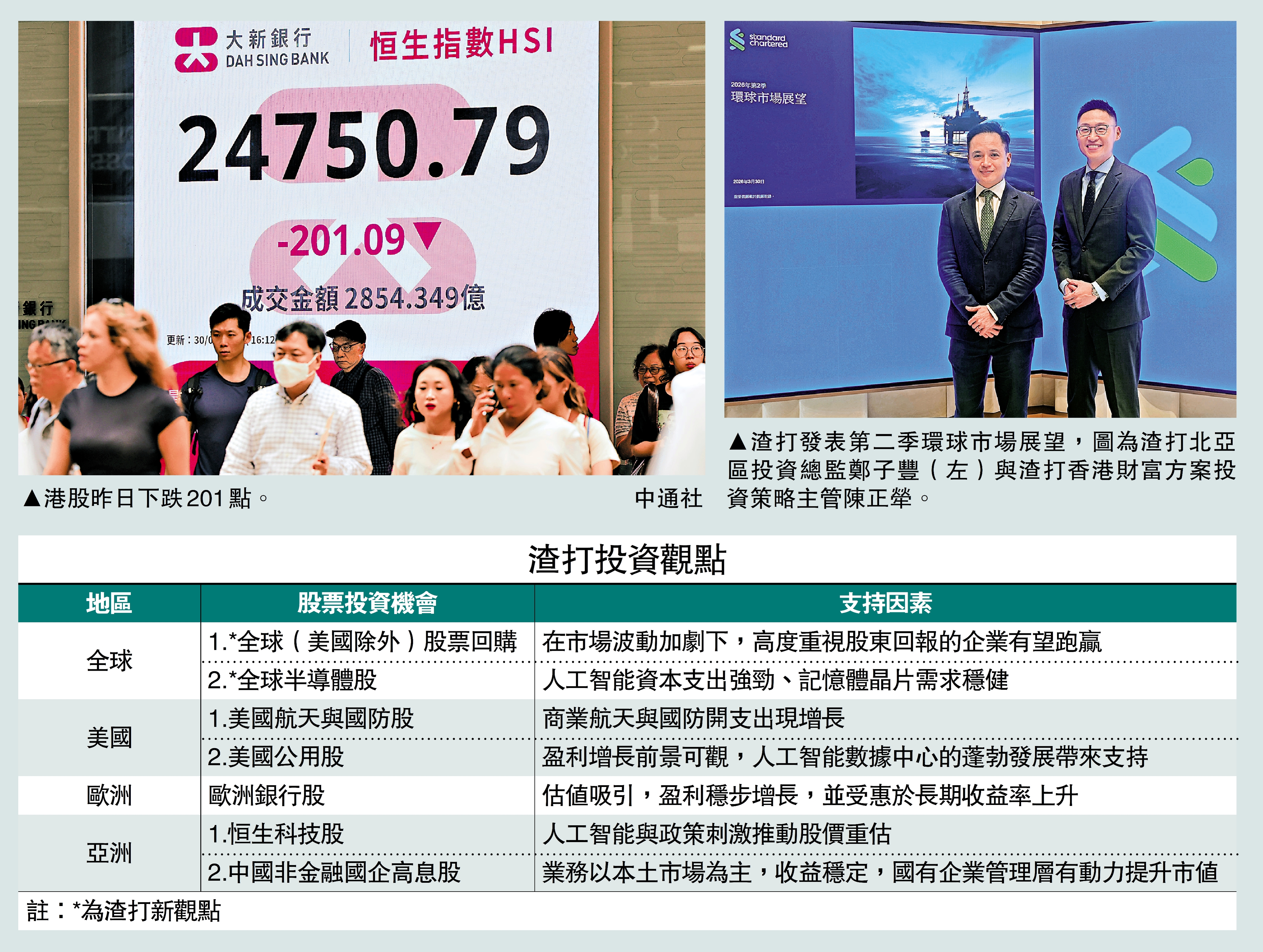 渣打財富方案首席投資辦公室昨日發表第二季環球市場展望報告。渣打去年將2026年恒指目標定在28000點至30000點,是因為當時未發生中東戰爭,「十五五」規劃亦未見明顯措施。最新已將恒指目標預測範圍縮窄至28000點至29000點。但認為目前港股估值相對合理,因為中國因素展現較強韌性。