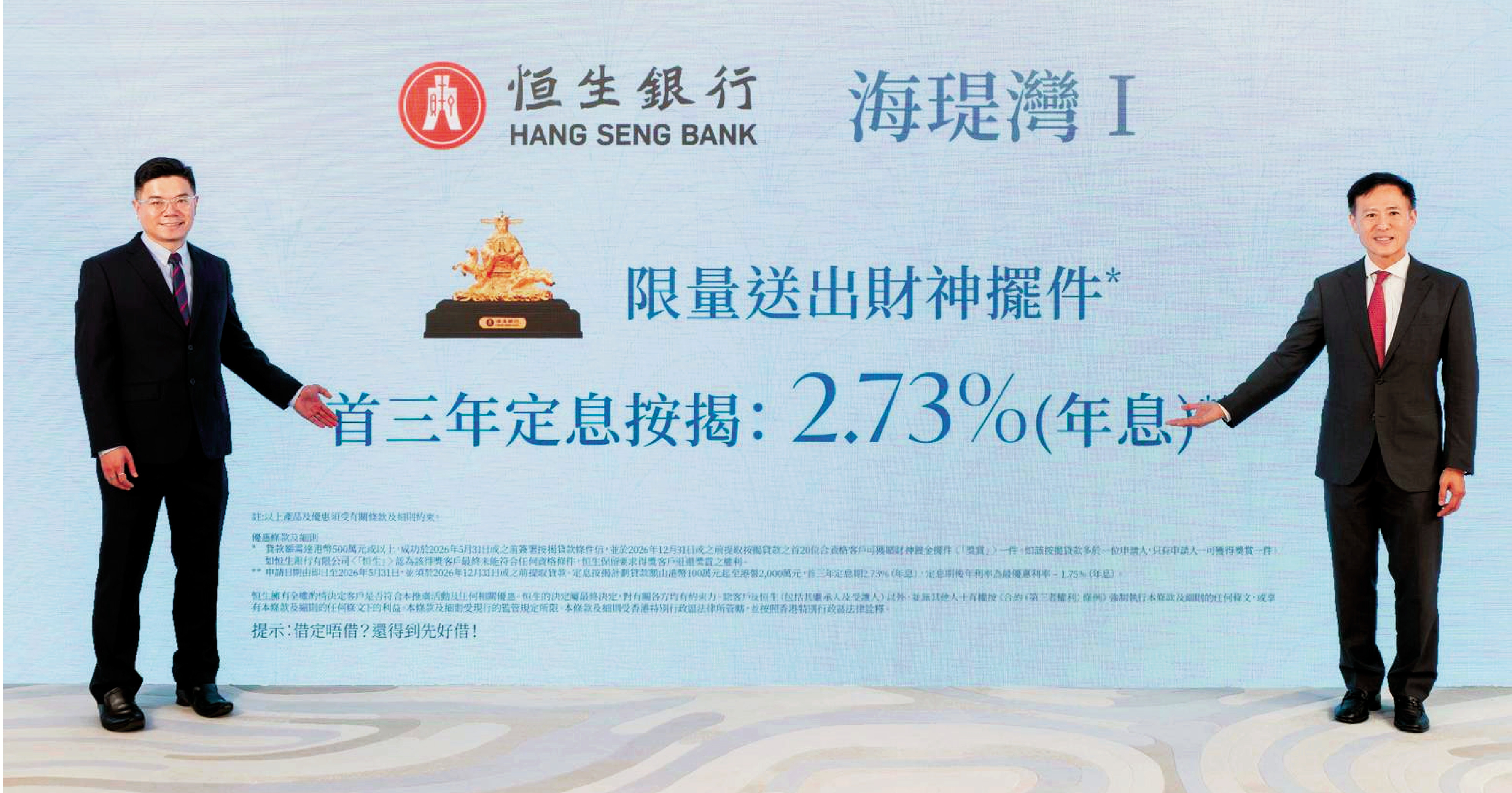 恒生銀行零售銀行存款、外匯及抵押貸款業務主管林禧彥指出,該行為海瑅灣Ⅰ買家提供多項按揭優惠,包括首20名合資格客戶可獲贈財神擺件、首3年定息按揭2.73厘,定息期後P減1.75厘、2888元的綠色按揭現金回贈等優惠。