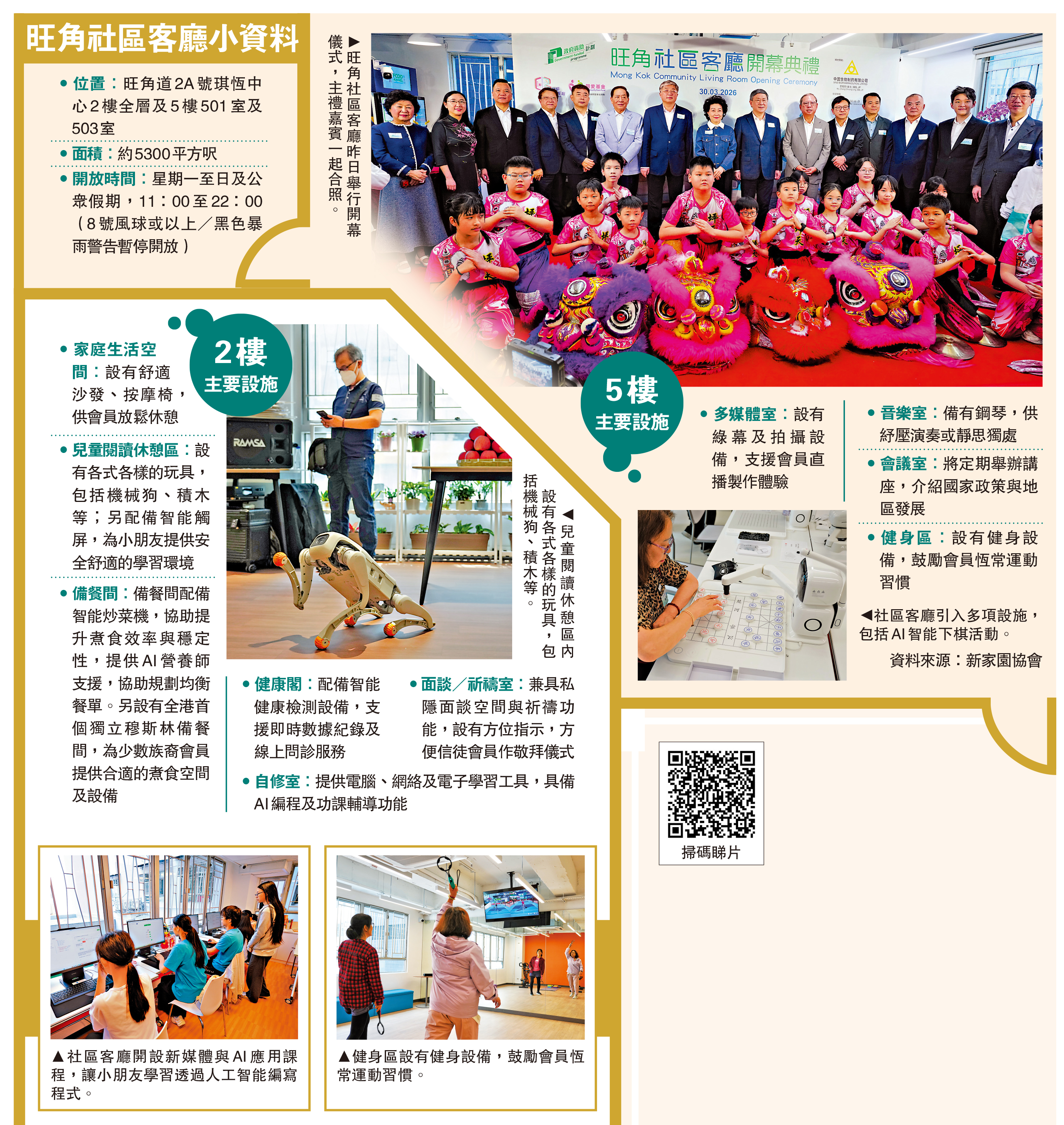 旺角社區客廳昨日開幕,是全港首個5年期的社區客廳,亦是全港首間引入多項人工智能設施的社區客廳,並開設新媒體與AI應用課程,讓小朋友學習透過人工智能編寫程式。為支援少數族裔使用者,客廳設有全港首個獨立穆斯林備餐區,亦有面談及祈禱室,方便信徒會員作敬拜儀式。