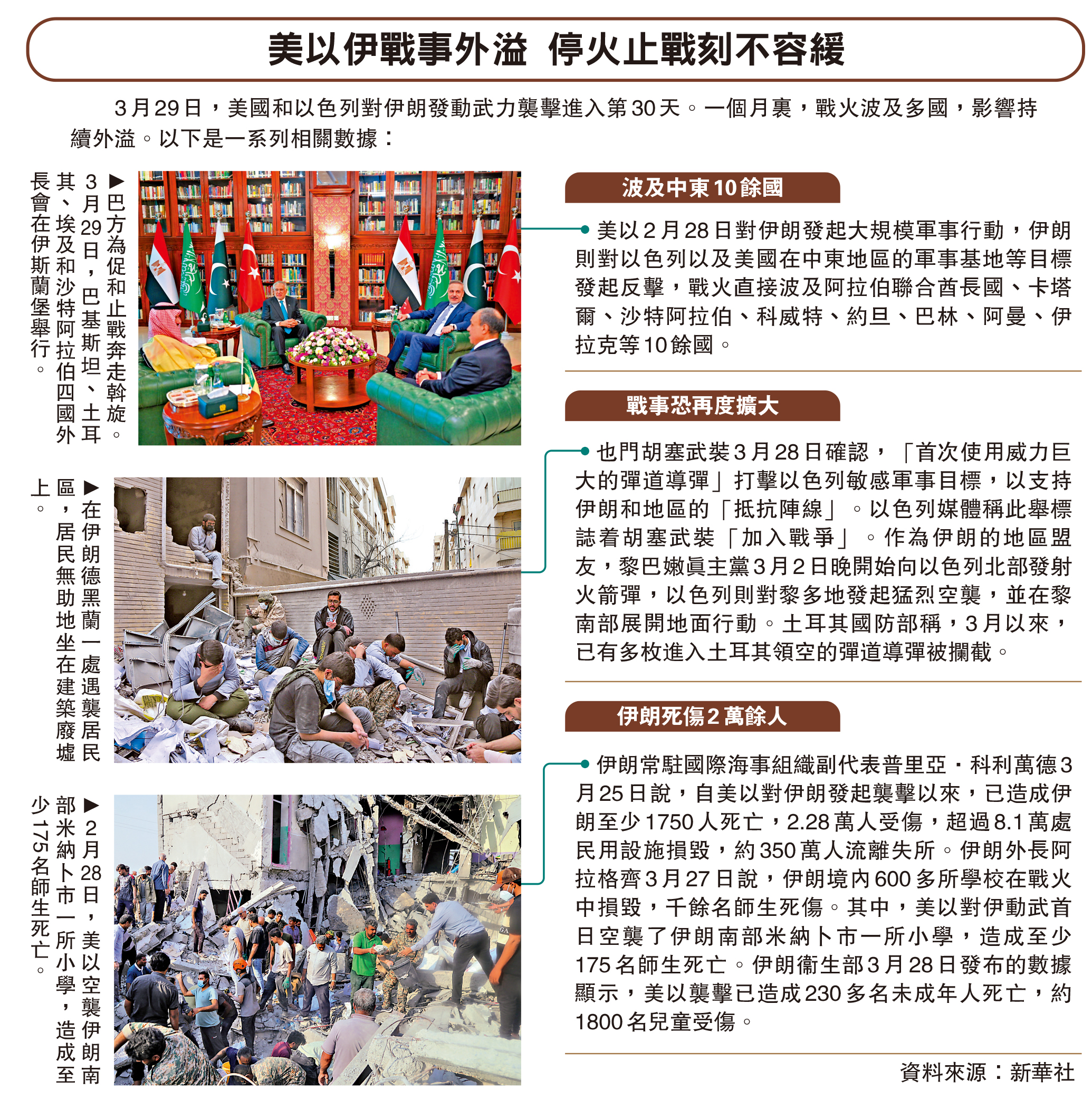 •伊朗常駐國際海事組織副代表普里亞·科利萬德3月25日說,自美以對伊朗發起襲擊以來,已造成伊朗至少1750人死亡,2.28萬人受傷,超過8.1萬處民用設施損毀,約350萬人流離失所。伊朗外長阿拉格齊3月27日說,伊朗境內600多所學校在戰火中損毀,千餘名師生死傷。其中,美以對伊動武首日空襲了伊朗南部米納卜市一所小學,造成至少175名師生死亡。伊朗衞生部3月28日發布的數據顯示,美以襲擊已造成230多名未成年人死亡,約1800名兒童受傷。