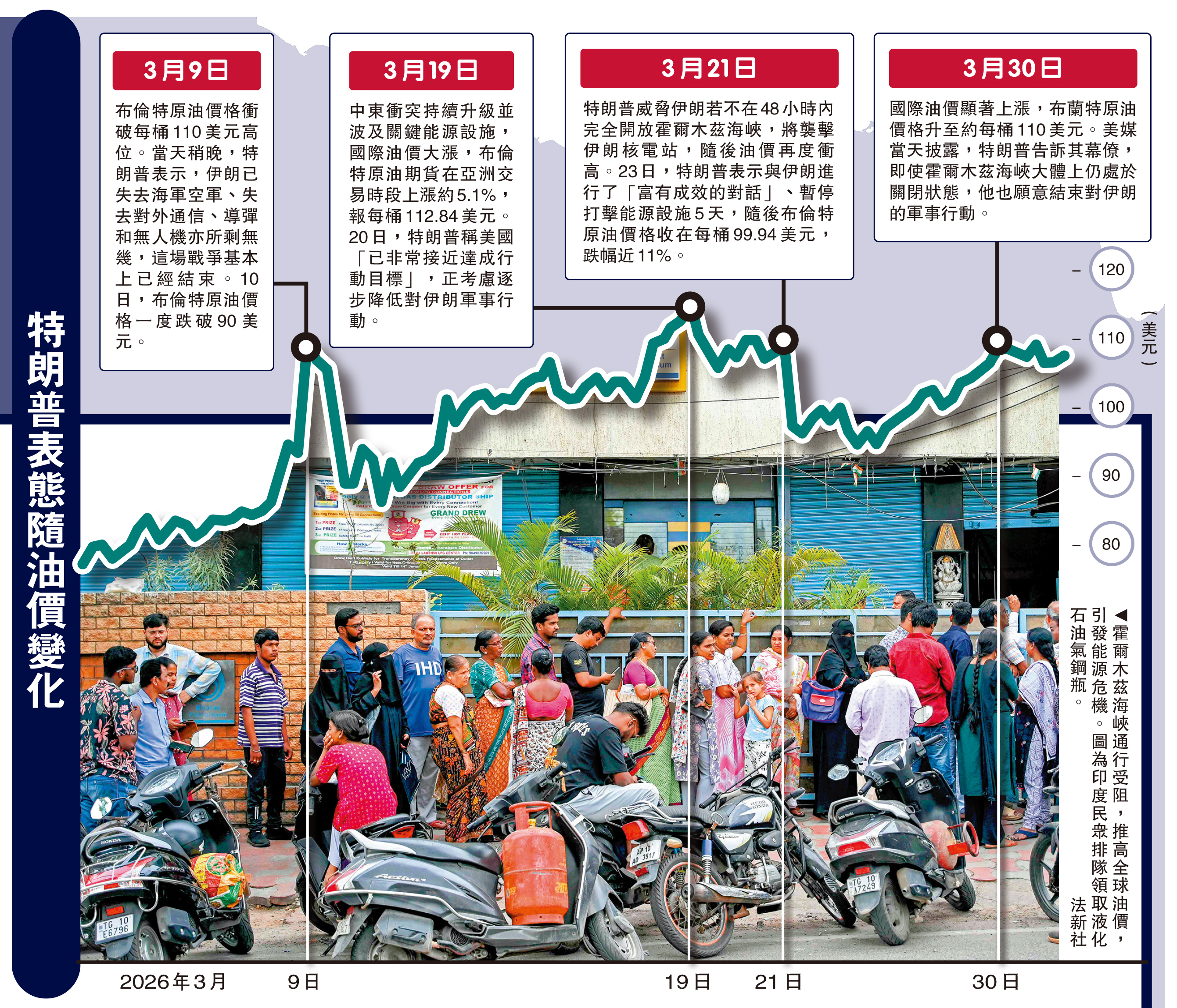 由於霍爾木茲海峽通行受阻,3月30日,美國原油基準價自2022年以來首次站上每桶100美元大關;美國汽車協會的數據顯示,當天全美平均汽油零售價升至每加侖4.018美元,較美國與伊朗2月底開戰前上漲逾1美元,達到特朗普兩屆任期內的最高點。