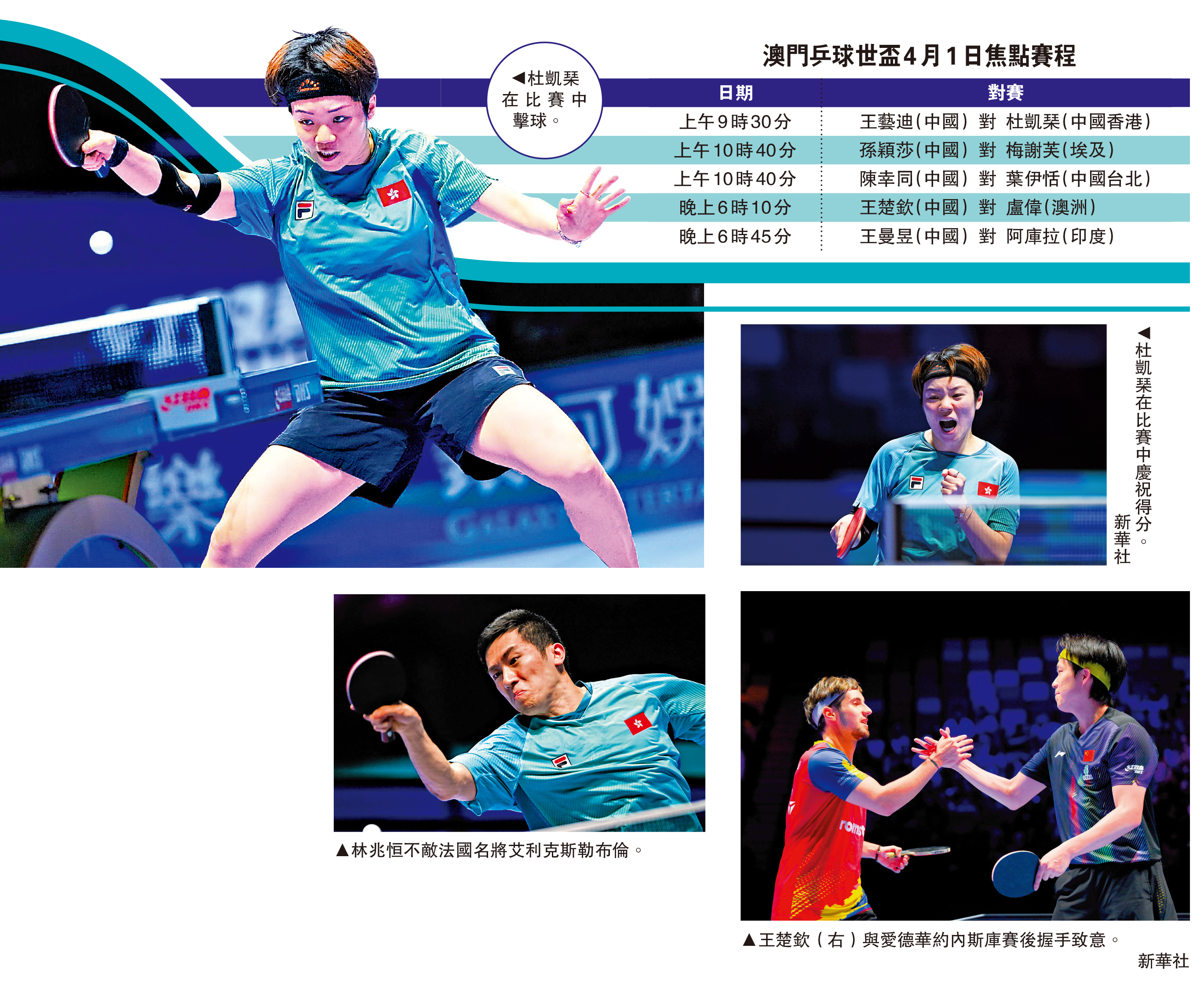 2026年澳門國際乒聯男子及女子世界盃3月31日續在中國澳門銀河綜藝館上演,中國香港球手繼續登場,首戰告捷的林兆恒在男子第10組與艾利克斯勒布倫爭出線,最終林兆恒直落三局落敗;與中國名將王藝迪同處女子第6組的杜凱琹,首戰對陣波蘭球手巴約爾,杜凱琹在落後的情況下以3:2反勝取得開門紅,今天杜凱琹與王藝迪對決爭奪出線資格。\大公報記者 梁潤森