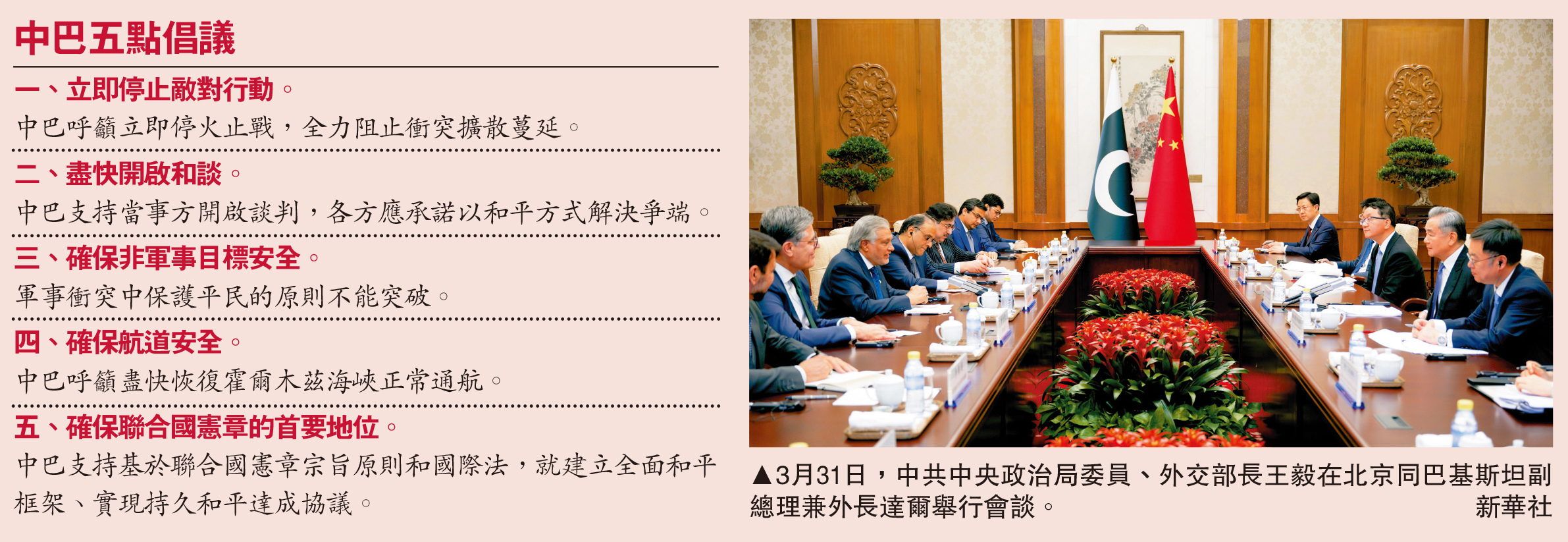 【大公報訊】據新華社報道:3月31日,中共中央政治局委員、外交部長王毅在北京同巴基斯坦副總理兼外長達爾舉行會談,圍繞當前國際和地區衝突問題深入交換意見。雙方共同發表了《中國和巴基斯坦關於恢復海灣和中東地區和平穩定的五點倡議》,呼籲立即停火開啟談判,恢復霍爾木茲海峽通航,並支持基於聯合國憲章宗旨原則和國際法,就建立全面和平框架、實現持久和平達成協議。