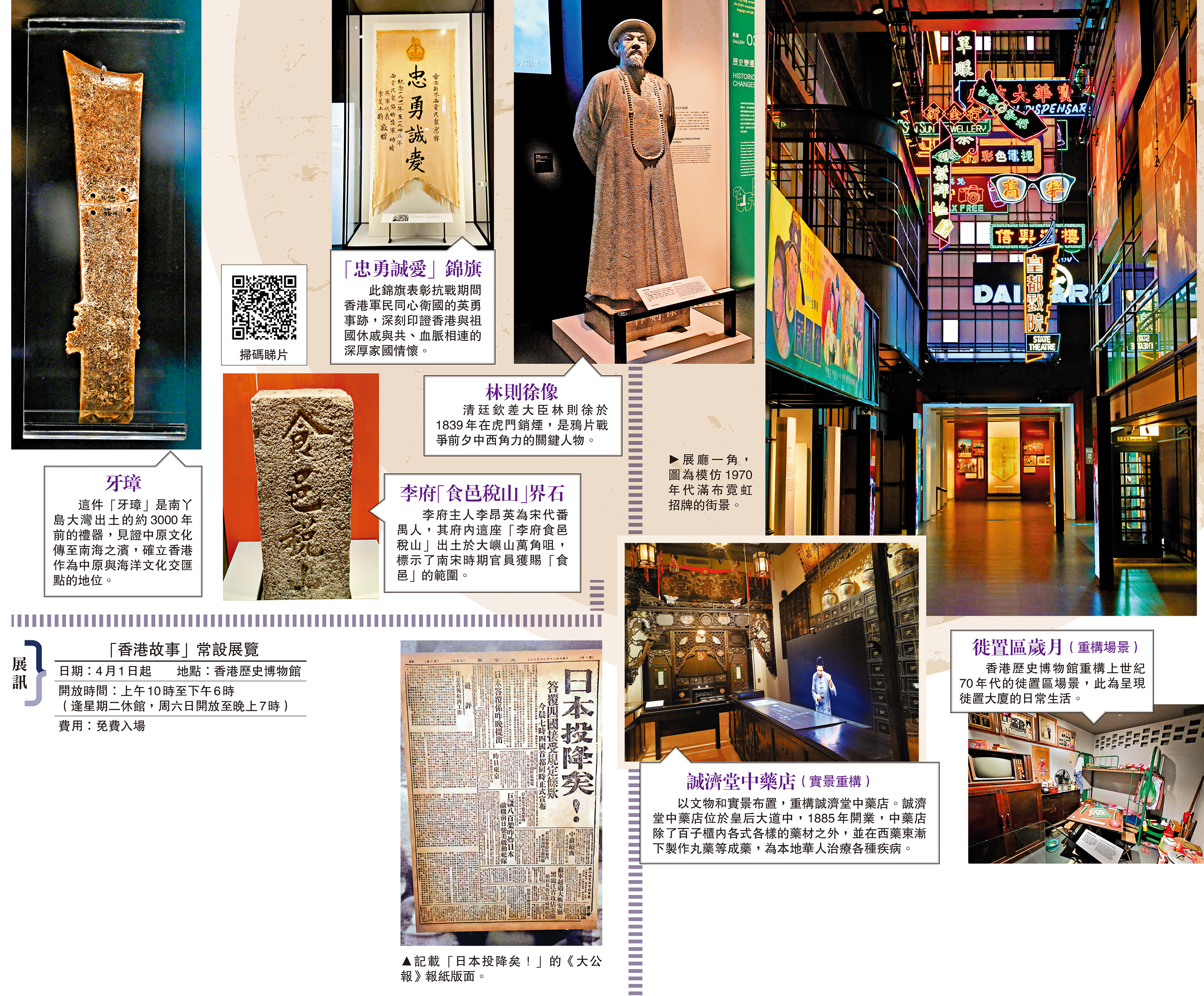香港歷史博物館今日開始,推出更新後的常設展覽「香港故事」。整個展覽通過四大主題「同根同源」「中西匯流」「共赴國難」及「國際都會」,分10個展區展出逾2800件珍貴展品,包括文物、歷史照片、影片及多媒體互動裝置,更以宏觀式、沉浸式的還原街景、打造「樓上樓」等布展手法,引領觀眾走進香港自史前時期至今的歷史歲月。