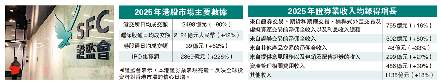 【大公報訊】證監會昨日發布《證券業財務回顧報告》,香港證券經紀行2025年淨盈利總額按年急增62%至717億元,創5年新高;證券業交易總額亦按年攀升52%至219萬億元,打破2021年創下的前高位紀錄。各項主要業務收入均大幅增長,其中來自證券交易的淨佣金收入、提供意見及包銷收入以及資產管理相關收入分別增加50%、27%及30%。