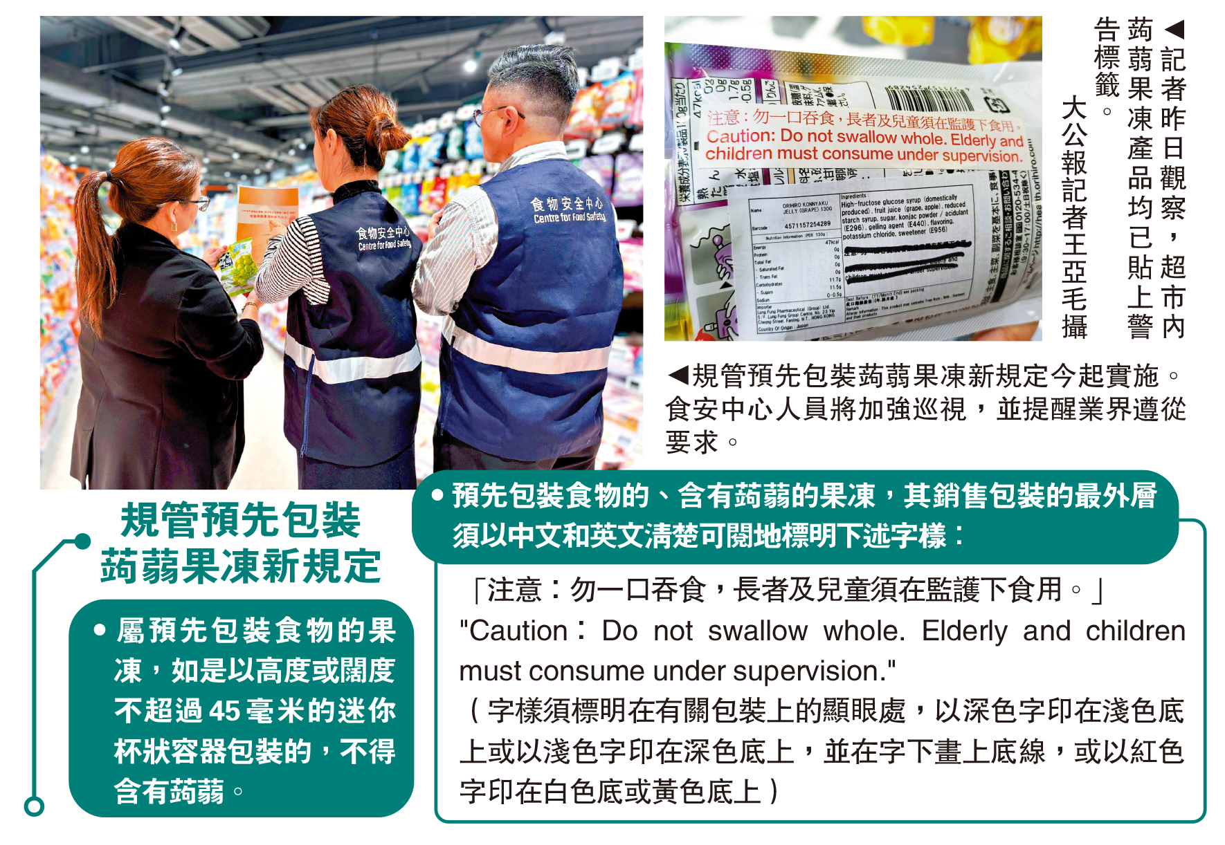 政府早前已開始加強對預先包裝蒟蒻果凍的規管,去年4月時就《2025年食物及藥物(成分組合及標籤)(修訂)規例》諮詢立法會,7月刊憲,8月時已完成立法會的先訂立後審議程序,今日起將正式實施。新規定下,禁止高度或闊度不超過45毫米的迷你杯裝蒟蒻果凍在香港出售;其他預先包裝的蒟蒻果凍產品須在包裝上以中、英文清晰標註「注意:勿一口吞食,長者及兒童須在監護下食用。」