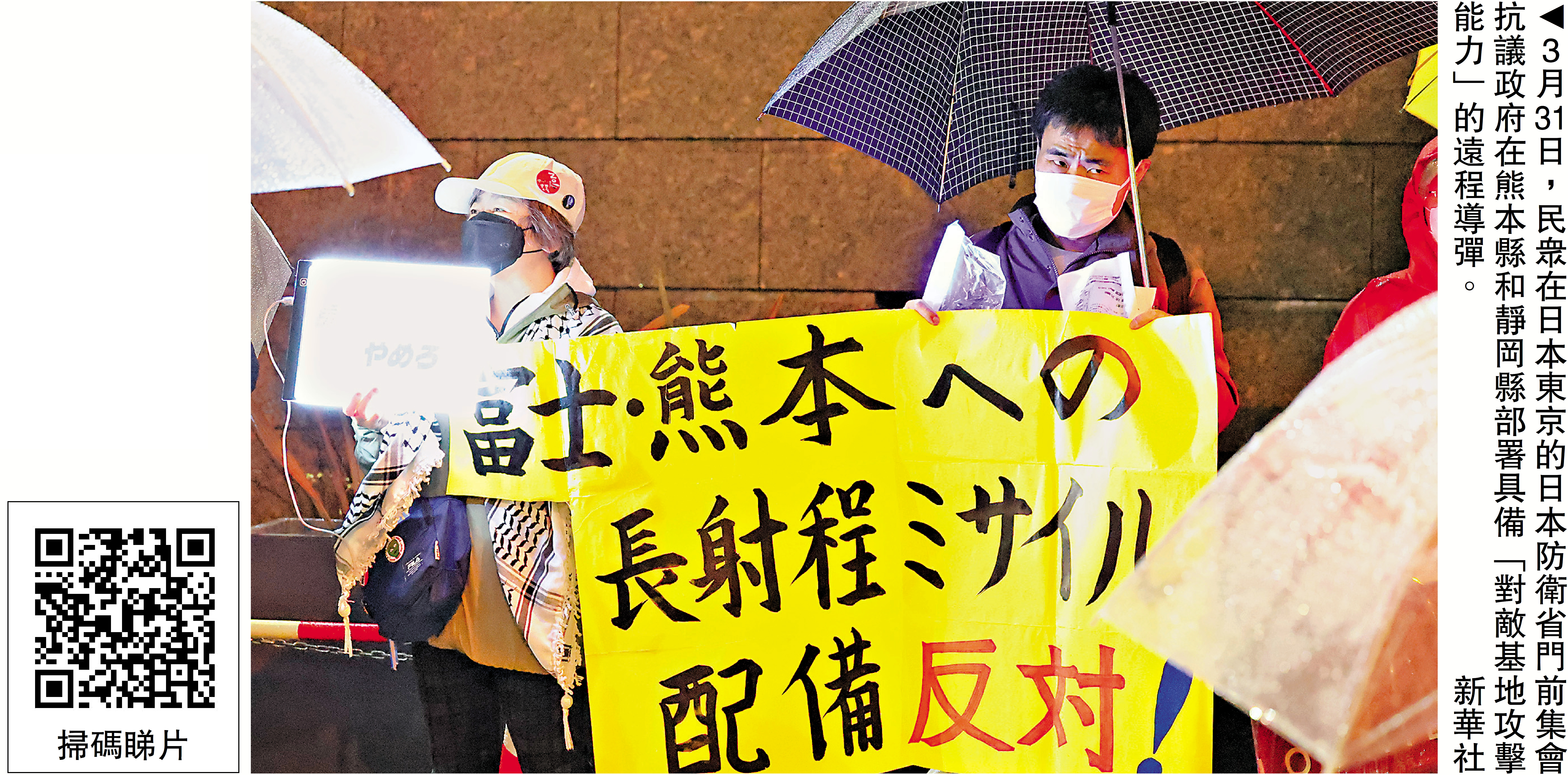【大公報訊】綜合新華社、中新社報道:有記者提問,3月31日,日本防衛大臣小泉進次郎宣布在熊本縣和靜岡縣部署了具備「對敵基地攻擊能力」遠程導彈,並稱日本面臨戰後最複雜安全環境,須構築防區外防衛能力。請問中方對此有何評論?