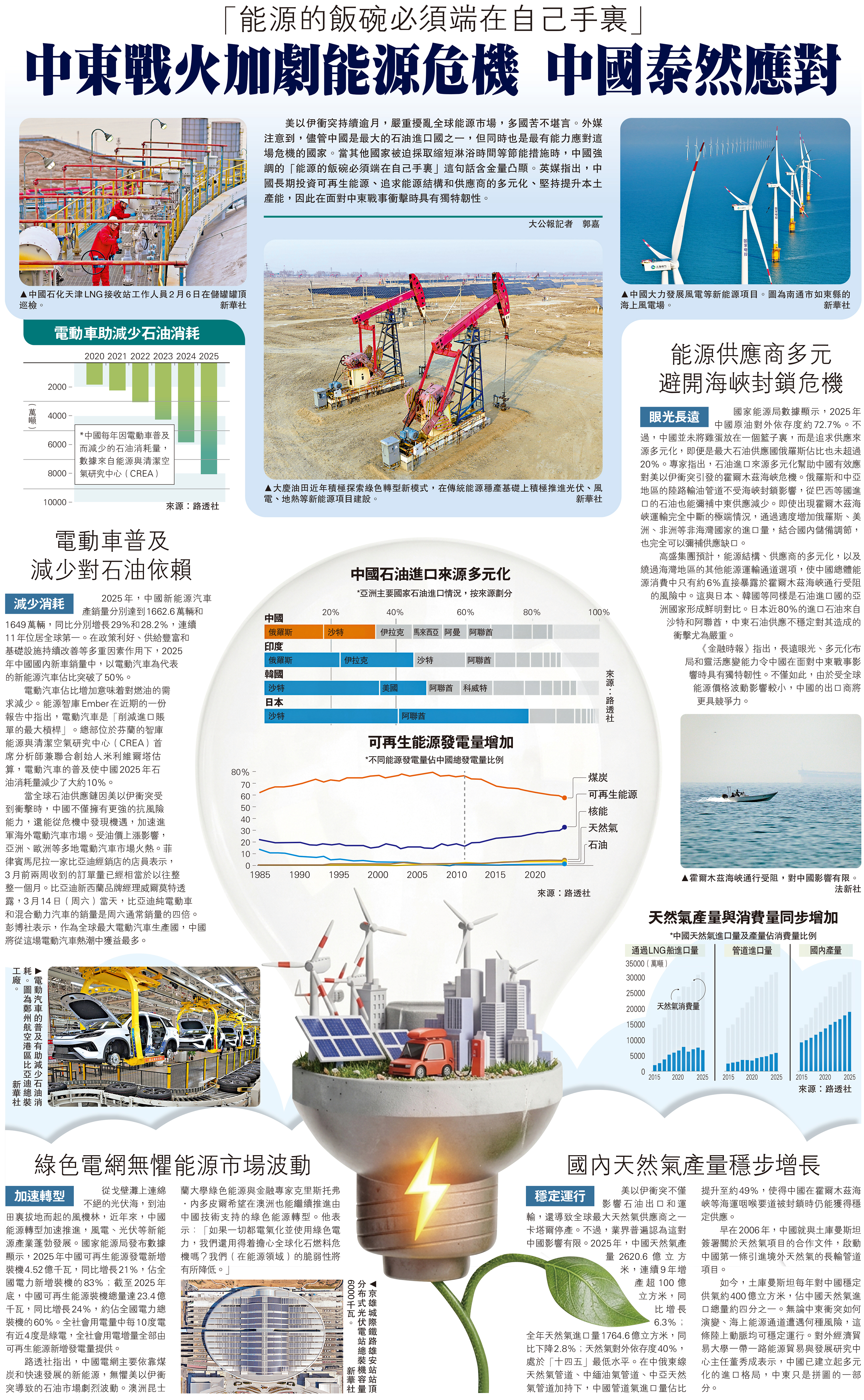 美以伊衝突持續逾月,嚴重擾亂全球能源市場,多國苦不堪言。外媒注意到,儘管中國是最大的石油進口國之一,但同時也是最有能力應對這場危機的國家。當其他國家被迫採取縮短淋浴時間等節能措施時,中國強調的「能源的飯碗必須端在自己手裏」這句話含金量凸顯。英媒指出,中國長期投資可再生能源、追求能源結構和供應商的多元化、堅持提升本土產能,因此在面對中東戰事衝擊時具有獨特韌性。\大公報記者 郭嘉