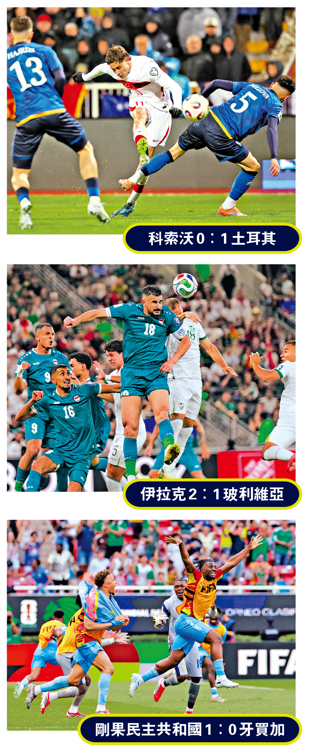 【大公報訊】今屆世界盃決賽周最後6席,經過各場附加賽決賽後悉數定出,當中一半屬於闊別多年的「稀客」,包括自2002年勇奪季軍後,奮鬥24年才再次入圍的歐洲球隊土耳其,時隔足足40年終於第2次亮相的亞洲隊伍伊拉克,以及超過半個世紀的52年後久別回歸的非洲剛果民主共和國。