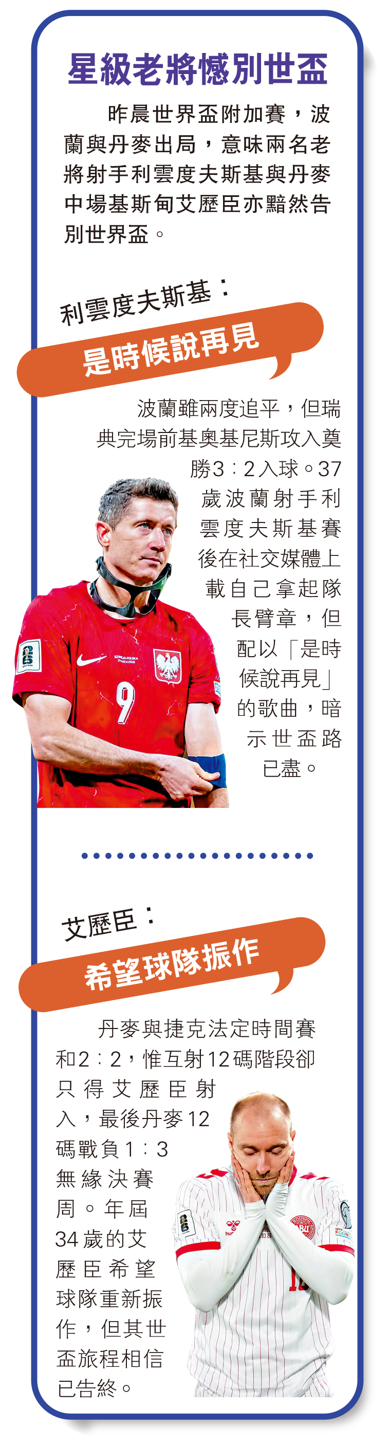 昨晨世界盃附加賽,波蘭與丹麥出局,意味兩名老將射手利雲度夫斯基與丹麥中場基斯甸艾歷臣亦黯然告別世界盃。