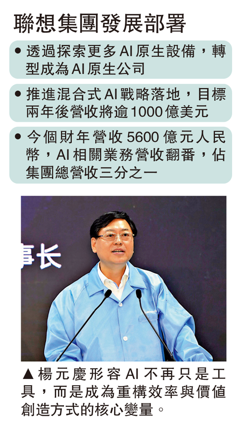 「AI不是附加項目,不是額外一層,更不是事後補充。」在北京出席聯想新財年誓師大會的楊元慶表示,將新財年定義為「AI交付」之年,目標是要完善生態體系,確立聯想在混合式AI領域的地位,他預期今個財年營收達到5600億元人民幣,其中AI的相關營收翻番,佔集團總營收三分之一。