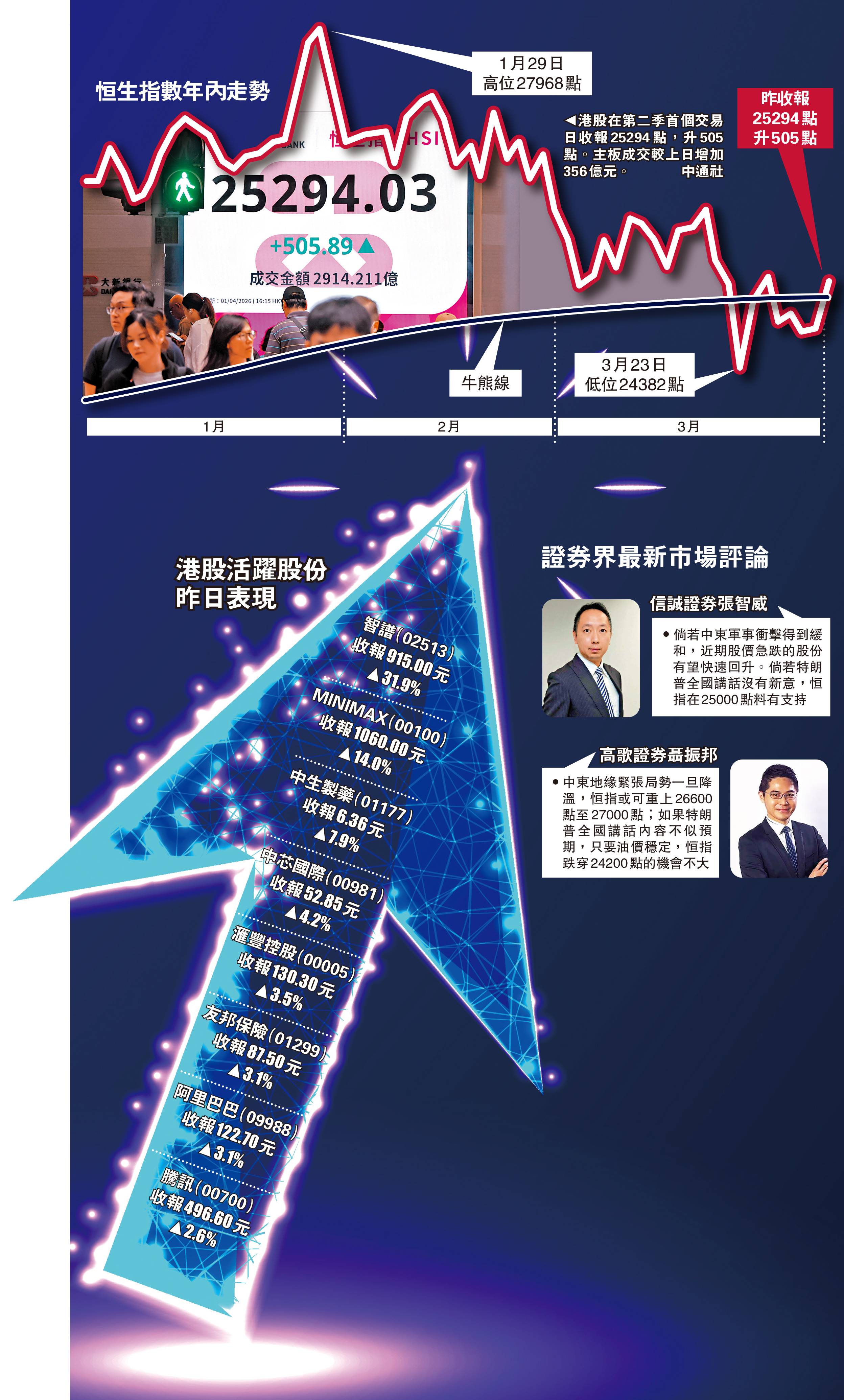 美國特朗普政府就中東軍事衝突發放鴿派言論,亞太區股市昨日普遍向上,而港股在第二季首個交易日高收,恒指收市升505點,重上250天牛熊分界線。AI股反彈力度較大,智譜(02513)股價升31%,直撲千元大關。MINIMAX(00100)股價升14%,重登金牛股。