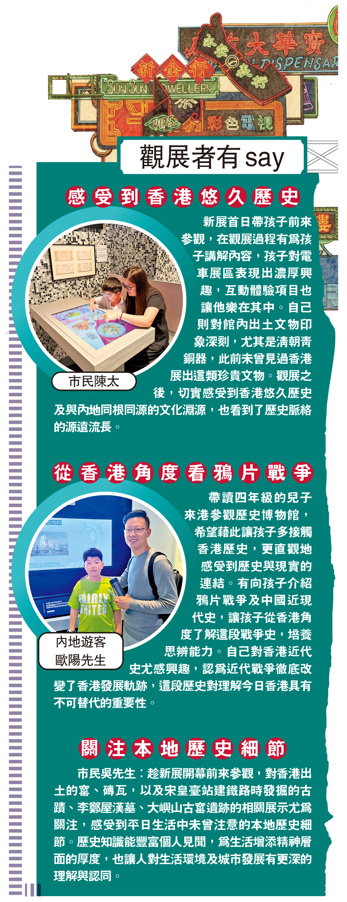 內地遊客歐陽先生:帶讀四年級的兒子來港參觀歷史博物館,希望藉此讓孩子多接觸香港歷史,更直觀地感受到歷史與現實的連結。有向孩子介紹鴉片戰爭及中國近現代史,讓孩子從香港角度了解這段戰爭史,培養思辨能力。自己對香港近代史尤感興趣,認為近代戰爭徹底改變了香港發展軌跡,這段歷史對理解今日香港具有不可替代的重要性。