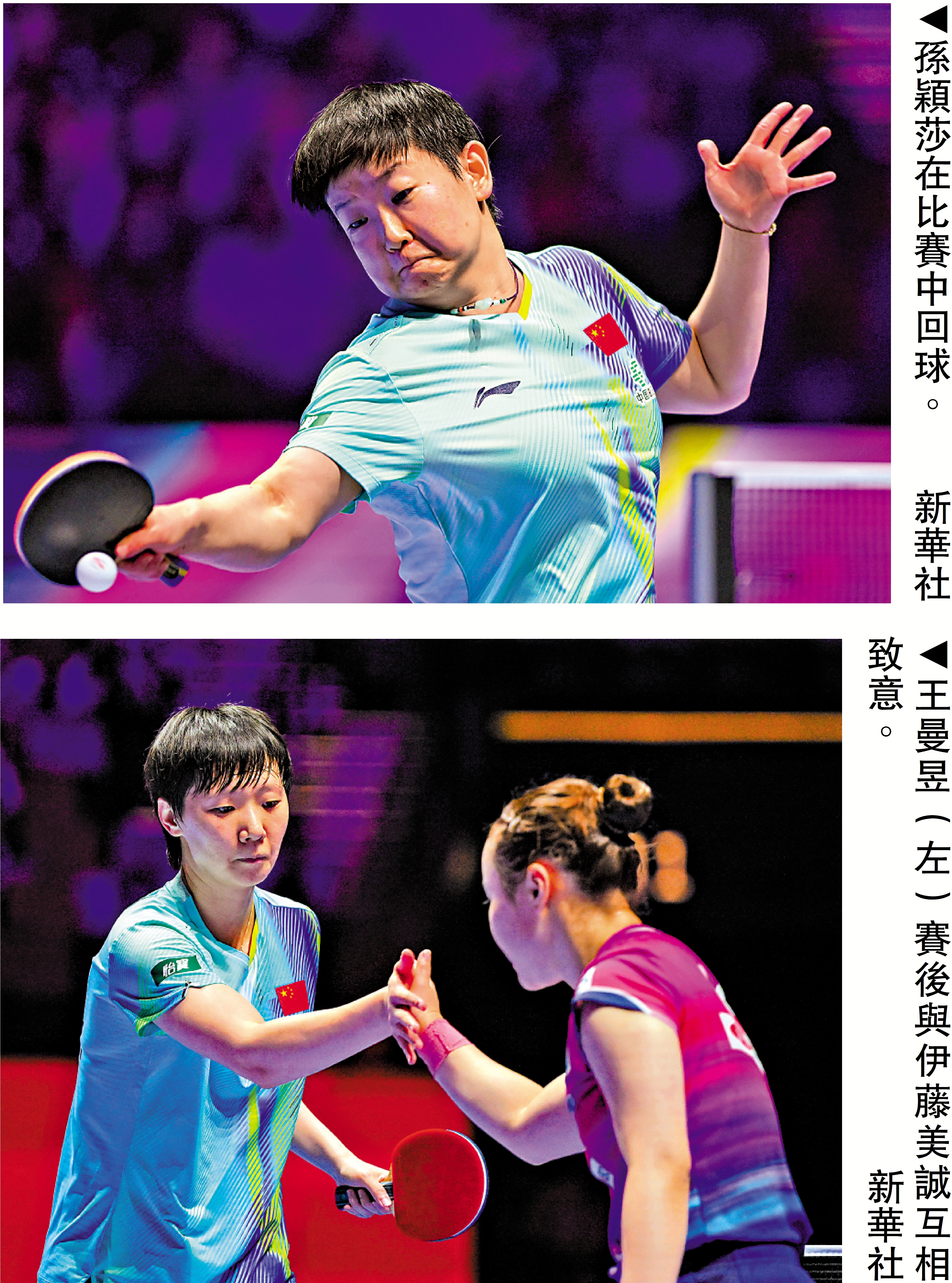 【大公報訊】記者朱家立報道:2026年澳門國際乒聯男子及女子世界盃2日在銀河綜藝館上演女單16強賽事,焦點賽事由國家隊「一姐」孫穎莎對陣隊友蒯曼,最終前者以局數4:2勝出。另一國乒好手王曼昱則以4:0橫掃日本的伊藤美誠,亦躋身8強。