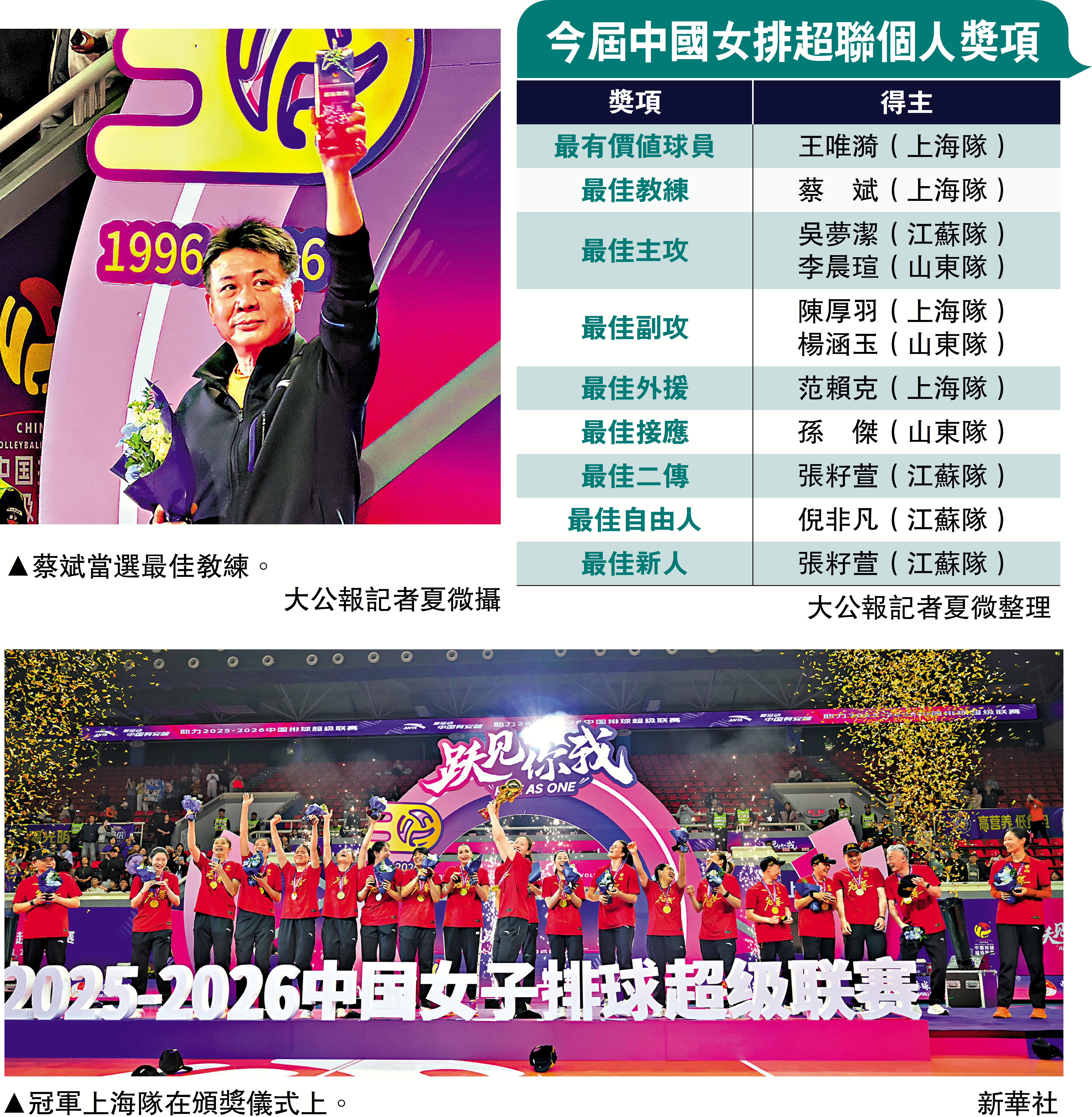 【大公報訊】記者夏微上海報道:1日晚,在上海進行的2025至2026賽季中國女子排球超級聯賽冠亞軍決賽第3回合較量中,坐鎮主場的上海女排以局數3:0輕鬆擊敗爭取衛冕冠軍江蘇女排,從而以大比分2:1奪得本季聯賽冠軍,時隔25年再度登頂。