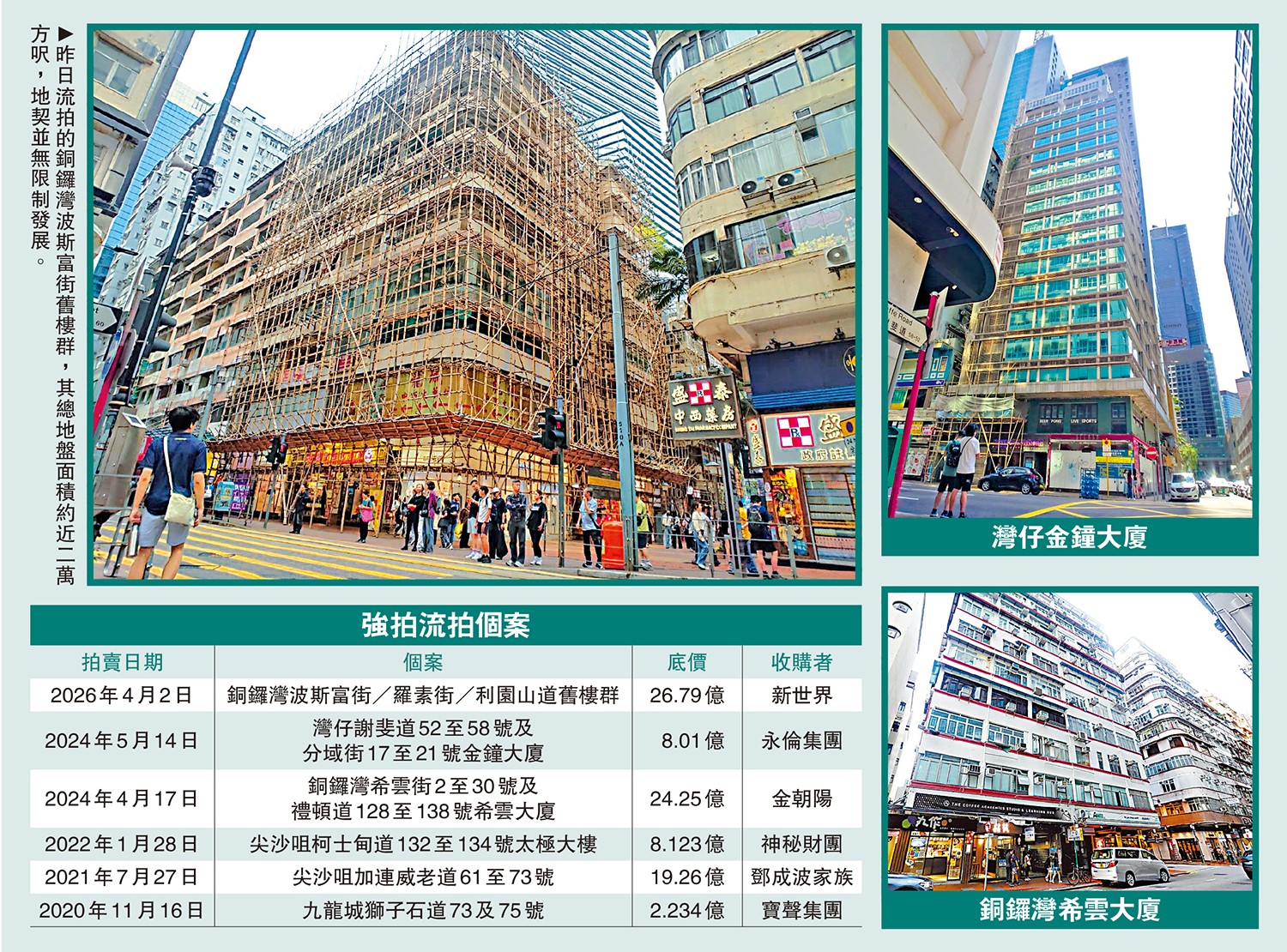 債務沉重的新世界(00017),其高價收購的銅鑼灣波斯富街舊樓群,於昨日進行強制拍賣時,卻無派員到場,導致近兩年來再出現流拍情況,這是自強拍條例正式生效以來的第6宗流拍,亦是涉及底價最大額的流拍個案。新世界稱決定是適時因應成本和效益,考慮市場供求,作出審慎的考慮,追求合理回報。\大公報記者 林志光