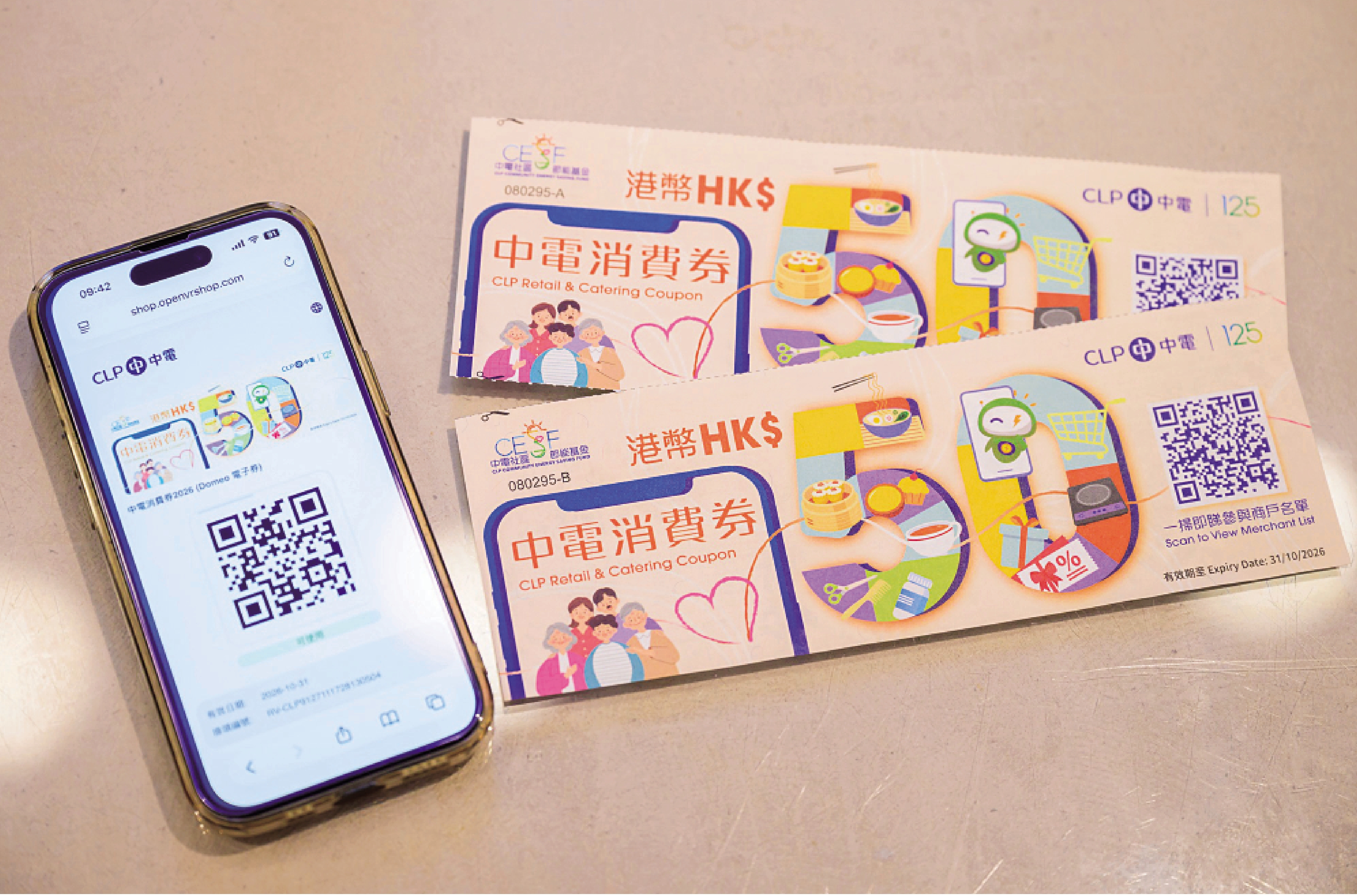 中電消費券有效期至2026年10月31日,參與商戶會在店舖外張貼中電消費券計劃標貼,以資識別。受惠人士可憑電子或實體消費券於參與商戶使用,亦可瀏覽計劃專頁,查閱參與商戶名單,以及了解計劃詳情,包括電子消費券的領取及使用方法。