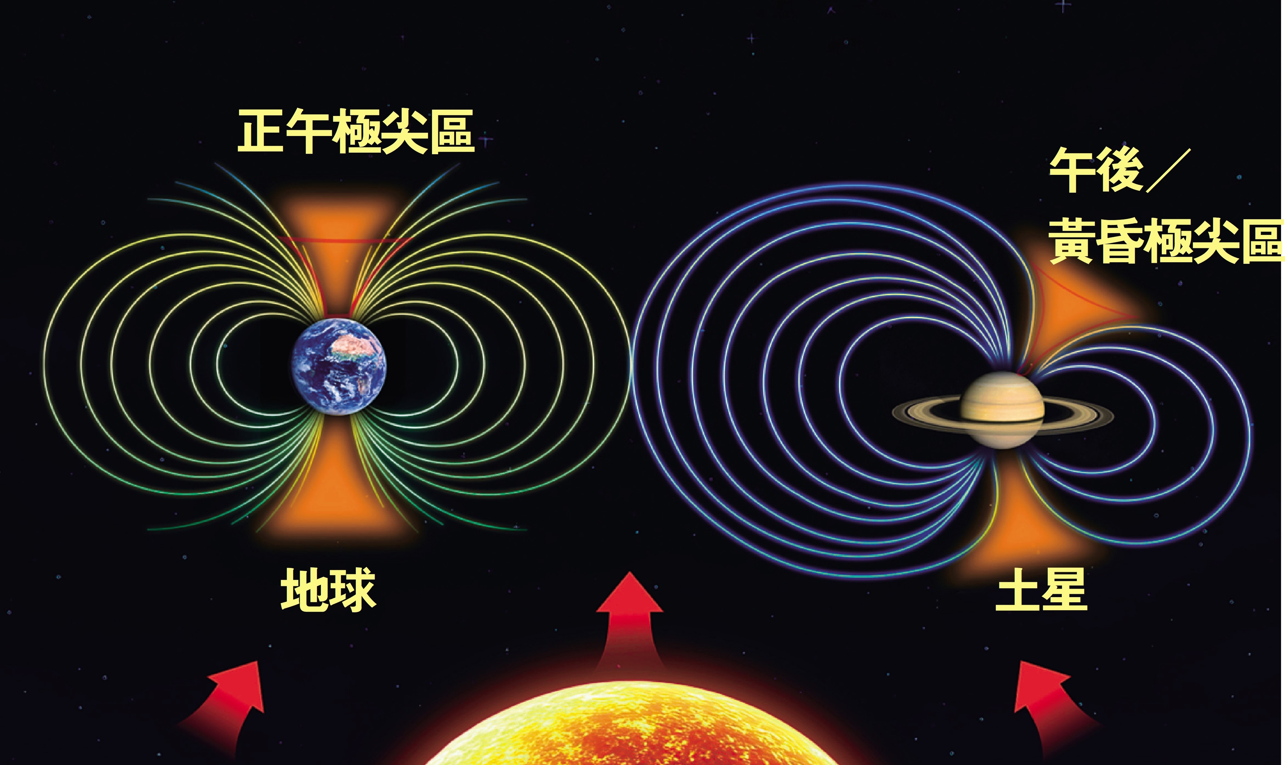 「磁層極尖區」是指行星磁層兩極附近呈漏斗狀的開口區域,帶電粒子可沿磁場線進入大氣層,並觸發極光現象。地球的極尖區一般位於朝向太陽的一側,通常與正午方向大致對齊,因此在南北兩極形成較對稱的分布。不過,港大團隊的研究發現,土星的情況並非如此,其粒子進入區域多數偏向午後位置,最常出現在下午1時至3時之間,部分甚至延伸至傍晚時段,令極尖區整體位置偏離極區中心,形態明顯不對稱。