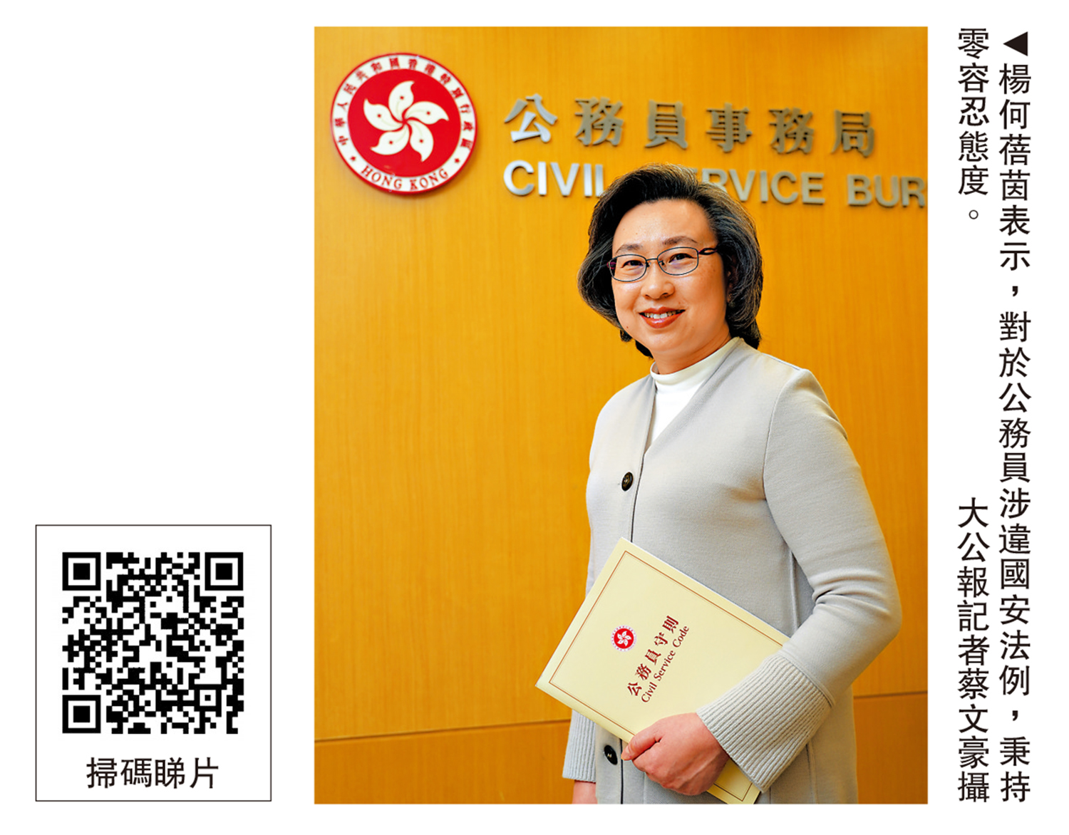 「跟國家安全有關,我們都是零容忍的。」談及國安法實施後出現的公務員違法情況,楊何蓓茵表示,公務員相比普通市民,有更大的責任維護國家安全。至於局方如何處理干犯國安罪行的公務員,她強調:「若公務員因國安罪行被定罪,則無需再經政府內部紀律程序,即時喪失公職人員身份。」