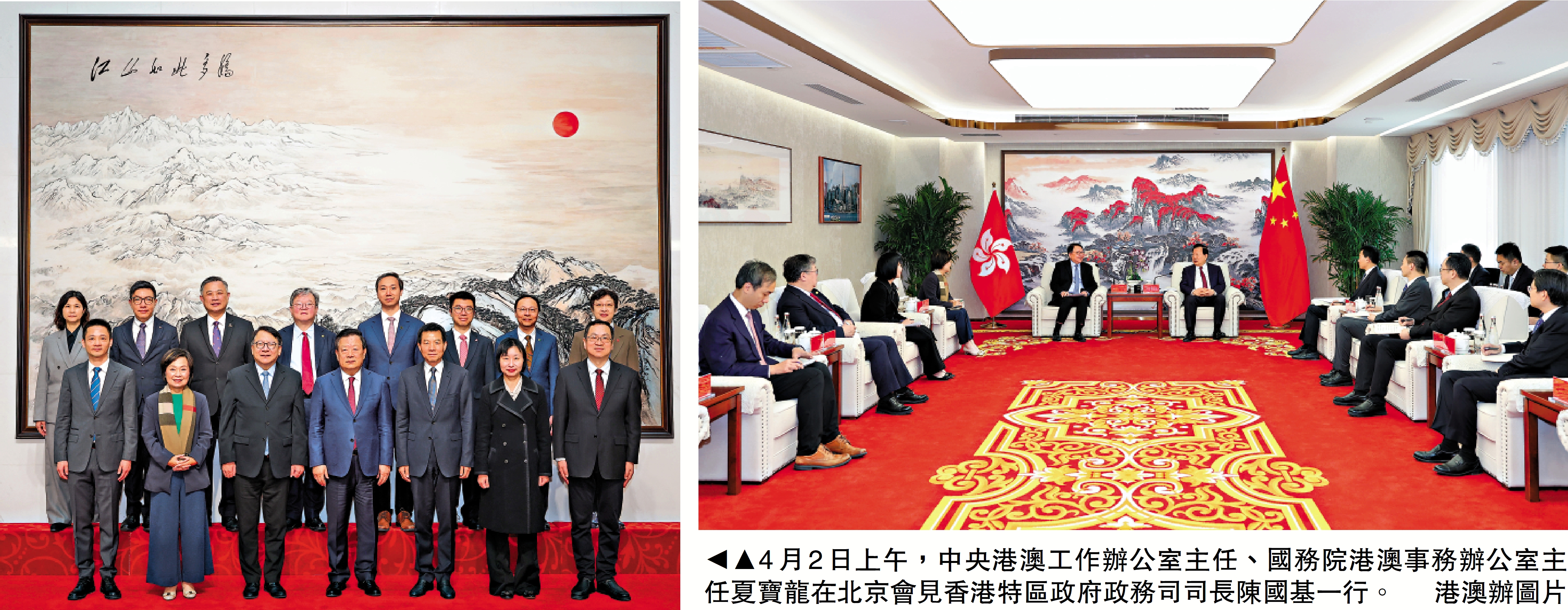 【大公報訊】據港澳辦網站消息:4月2日上午,中央港澳工作辦公室主任、國務院港澳事務辦公室主任夏寶龍在北京會見香港特區政府政務司司長陳國基一行。