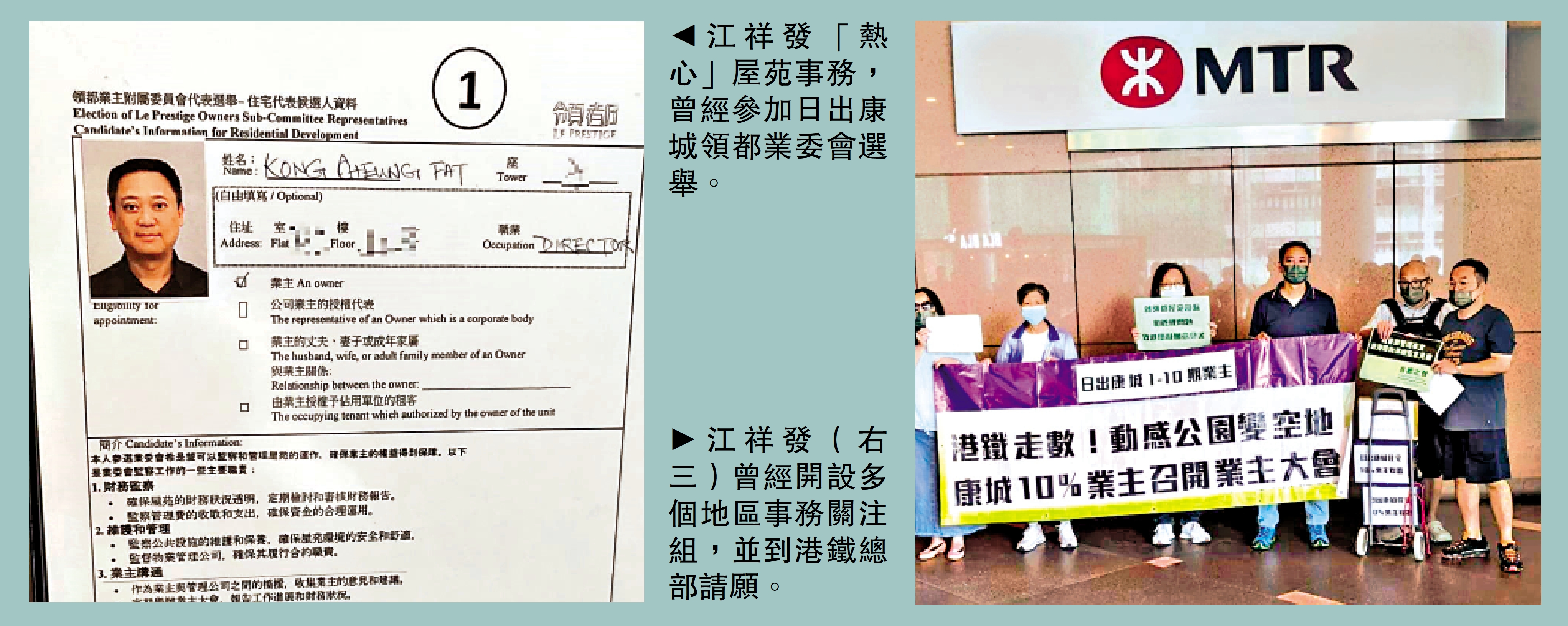 對於有人質疑他已是宏福苑法團委員,雖已搬離日出康城但仍干預該屋苑事務,為何如此「熱心」?他反問記者:「一個人唔可以做幾個業委嗎?又不是日日要開會,我應付到就可以。」