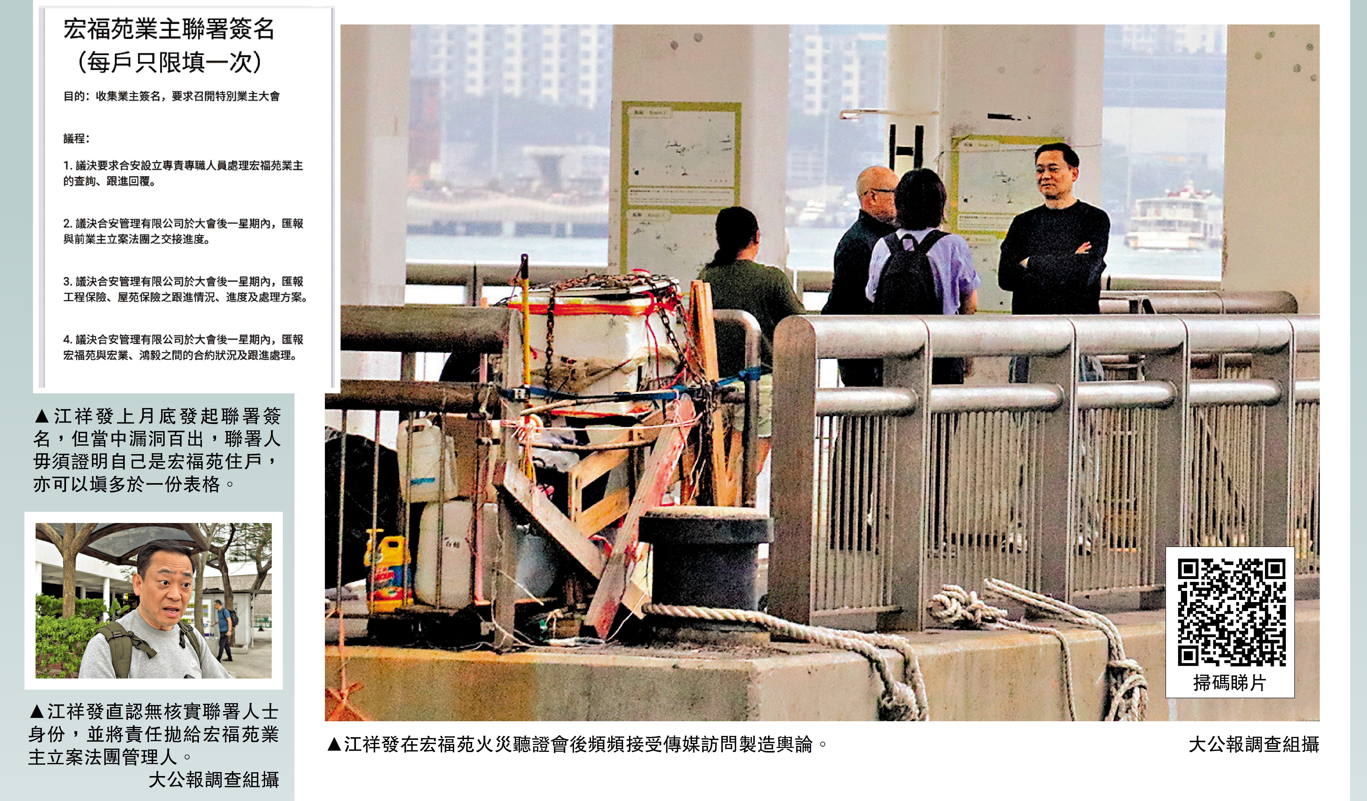 大埔宏福苑火災獨立委員會近日舉行多場聽證會,宏福苑前法團管委會成員江祥發於會上頻頻現身發言,引起眾人關注。江祥發曾稱上月發起聯署,更指收集到超過500戶居民簽名,對政府提出九項要求,其中包括議決把「原址重建」列為首要方案。然而,大公報記者連日收到宏福苑居民對聯署提出質疑,踢爆聯署無需任何住戶證明,任何人都能夠無限量填寫,直言聯署水分太大。