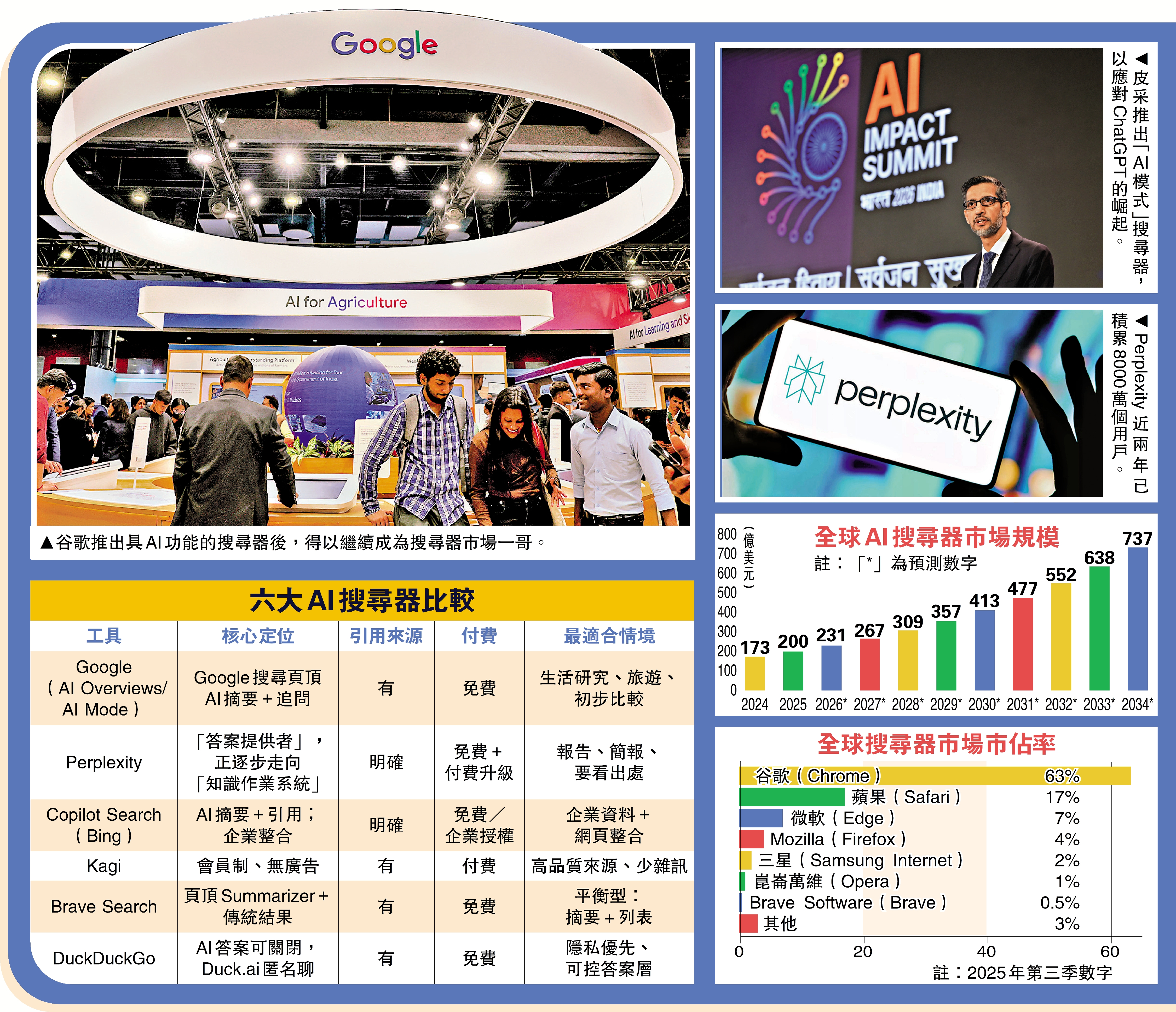 人工智能(AI)熱潮方興未艾,隨着ChatGPT等AI聊天機器人應用急速興起,在過去接近二、三十年來一直主導網上搜尋器的谷歌,地位受到嚴重威脅。為了維持主導地位,谷歌近年將AI功能導入其搜尋引擎、瀏覽器與應用程式中,讓使用者能以對話形式獲得答案,而非傳統上的藍色連結清單,這種新服務令谷歌搜尋器在去年得以繼續成為市場上的一哥。然而,AI初創Perplexity、微軟Copolit等公司,亦大舉進軍AI搜尋器市場,令谷歌面對另一種新挑戰。