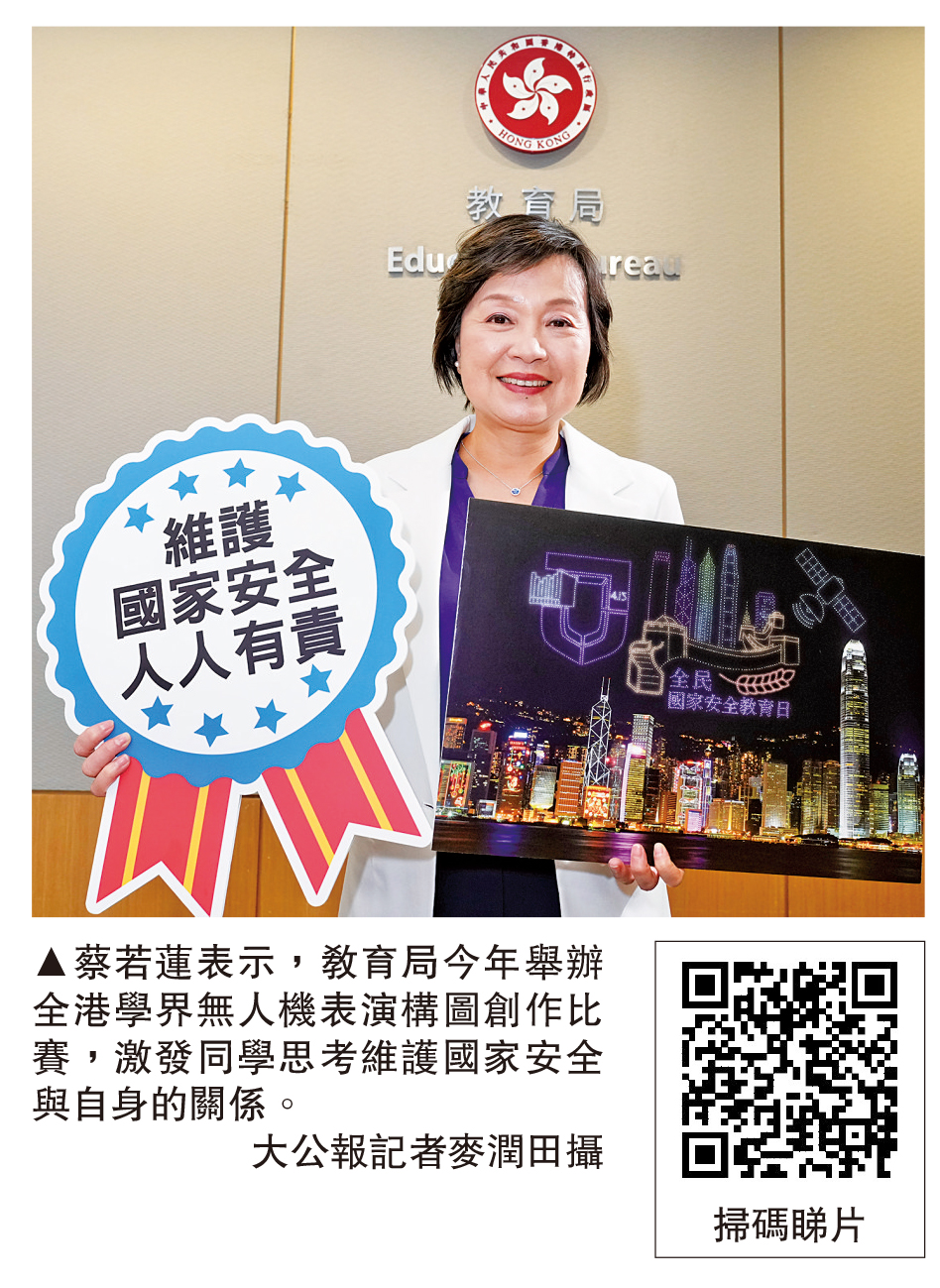 教育局局長蔡若蓮接受《大公報》專訪表示,安全對香港未來發展至關重要,國安法的實施起到「定海神針」的作用,意義重大。國家安全沒有局外人,每個人都是受益者、責任者、守護者與實踐者。我們要主動承擔這份責任,鞏固香港的國際教育樞紐地位,為教育發展創造穩定環境,實現安全與發展雙軌平衡。\大公報記者 盛德文