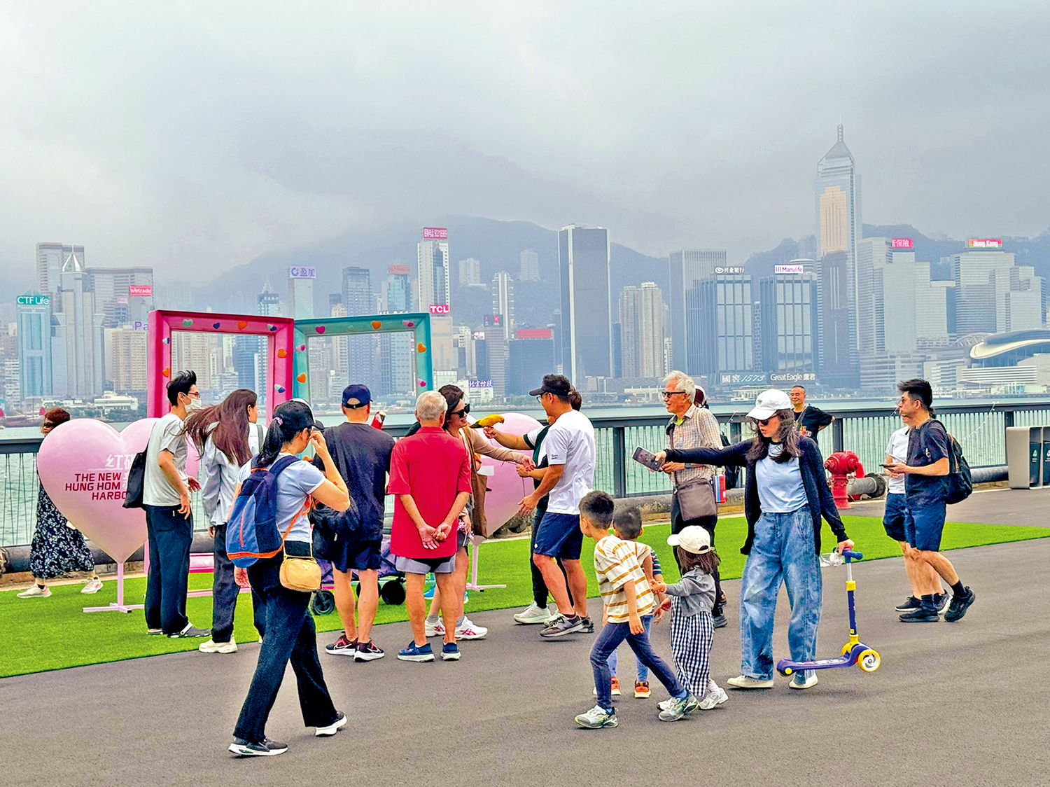 昨日陰天,卻仍有不少遊人到紅磡新海濱,在這個寬敞的新地標一覽維港美景。天橋上,不少行人停駐,俯拍地面上的「紅磡」字樣。而海濱空間內,有人帶小狗散步,有人拍攝海景,有人在全運會吉祥物、陀螺櫈、彩色小馬、愛心相框等裝置旁打卡。有市民帶上寵物鳥,引來路人圍觀。
