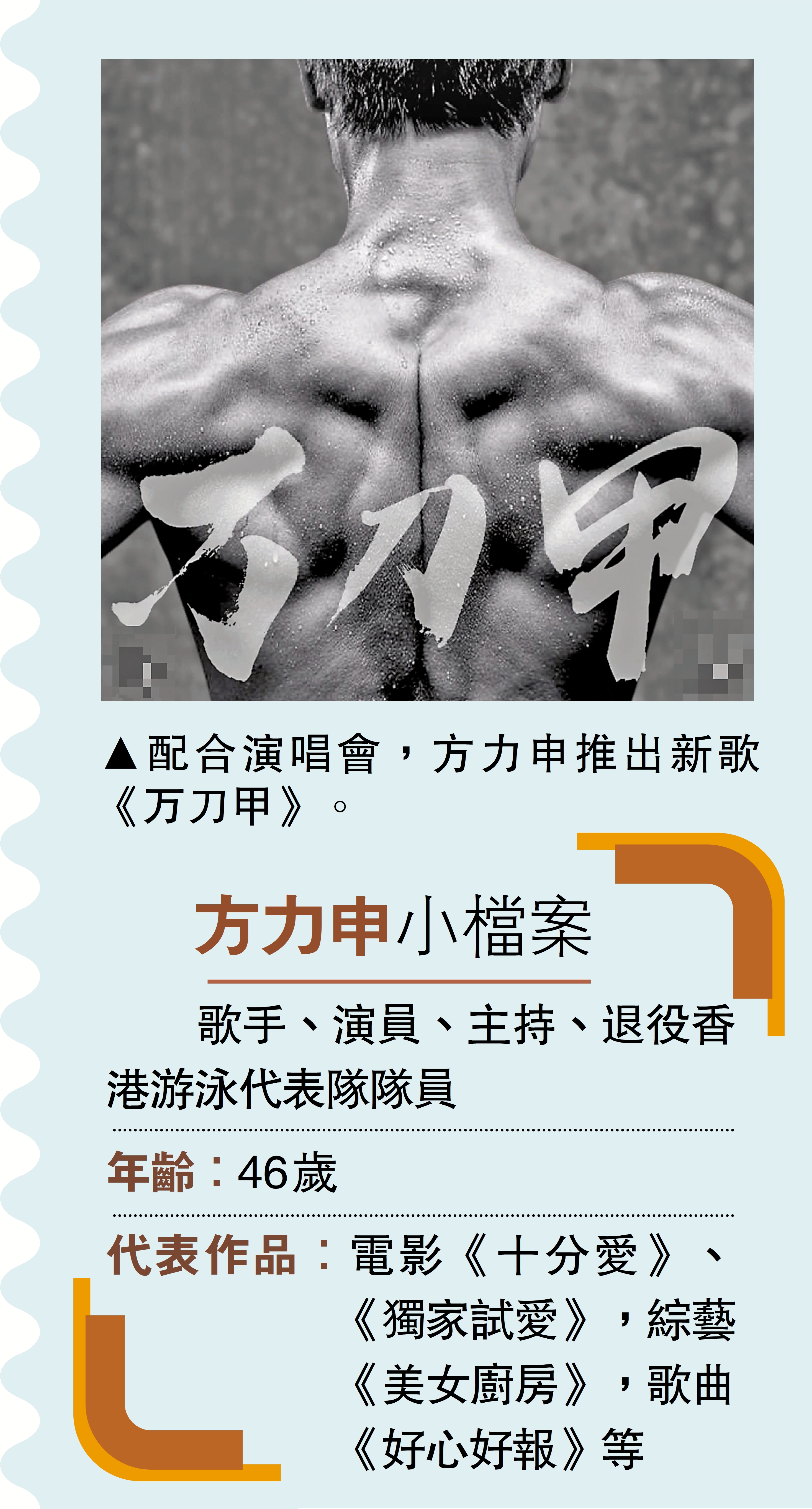 配合演唱會,小方近日亦推出新歌《万刀甲》。小方指初出道不久,已有「万刀甲」這個花名,有時身邊的朋友都會這樣叫他。但原來很多人不知道這個名字是有貶義。他說:「當時有人為我起了這個名,將方力申三個字的『頭』去掉,變成「万刀甲」,意思是我不會有出人頭地的一天。但正是這個名字,成為我的動力,令自己做得更好,所以多年來我都好努力。今天我能在紅館開演唱會,雖然比很多歌手遲,但我仍想找回當日為我改這個名的那個人,送幾張演唱會票給他。我真的不介意這個名字。」