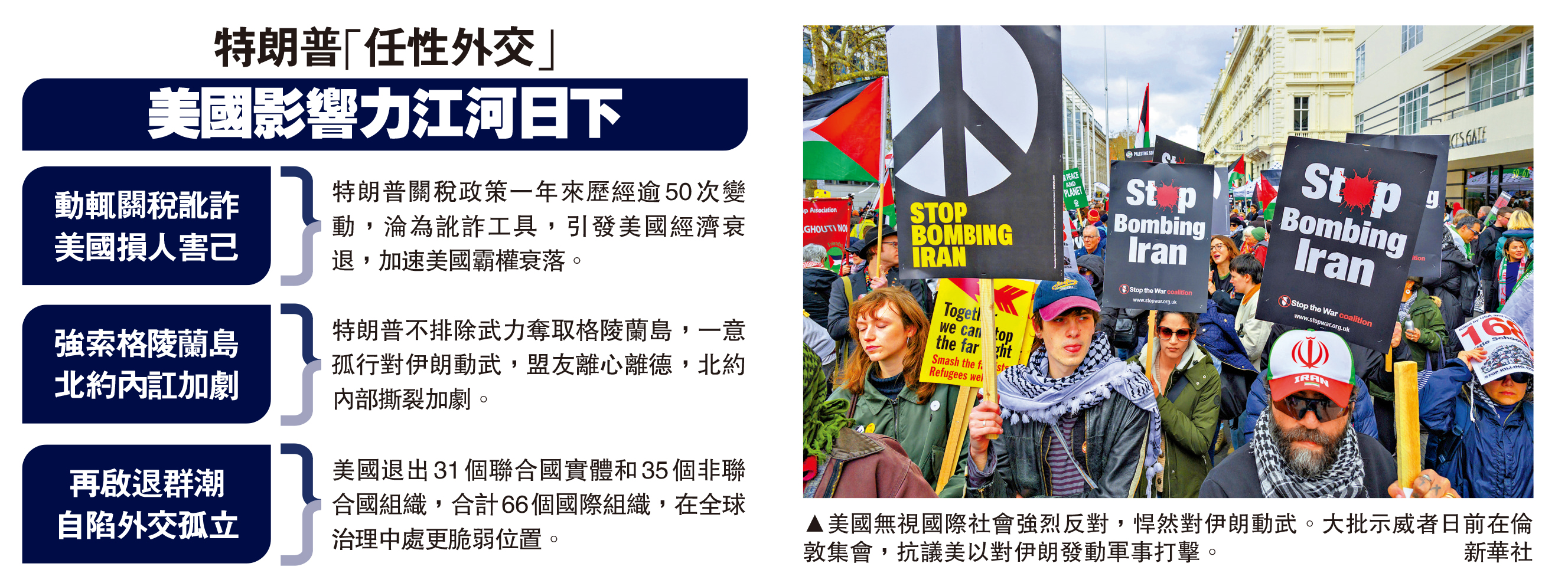 特朗普關稅政策一年來歷經逾50次變動,淪為訛詐工具,引發美國經濟衰退,加速美國霸權衰落。