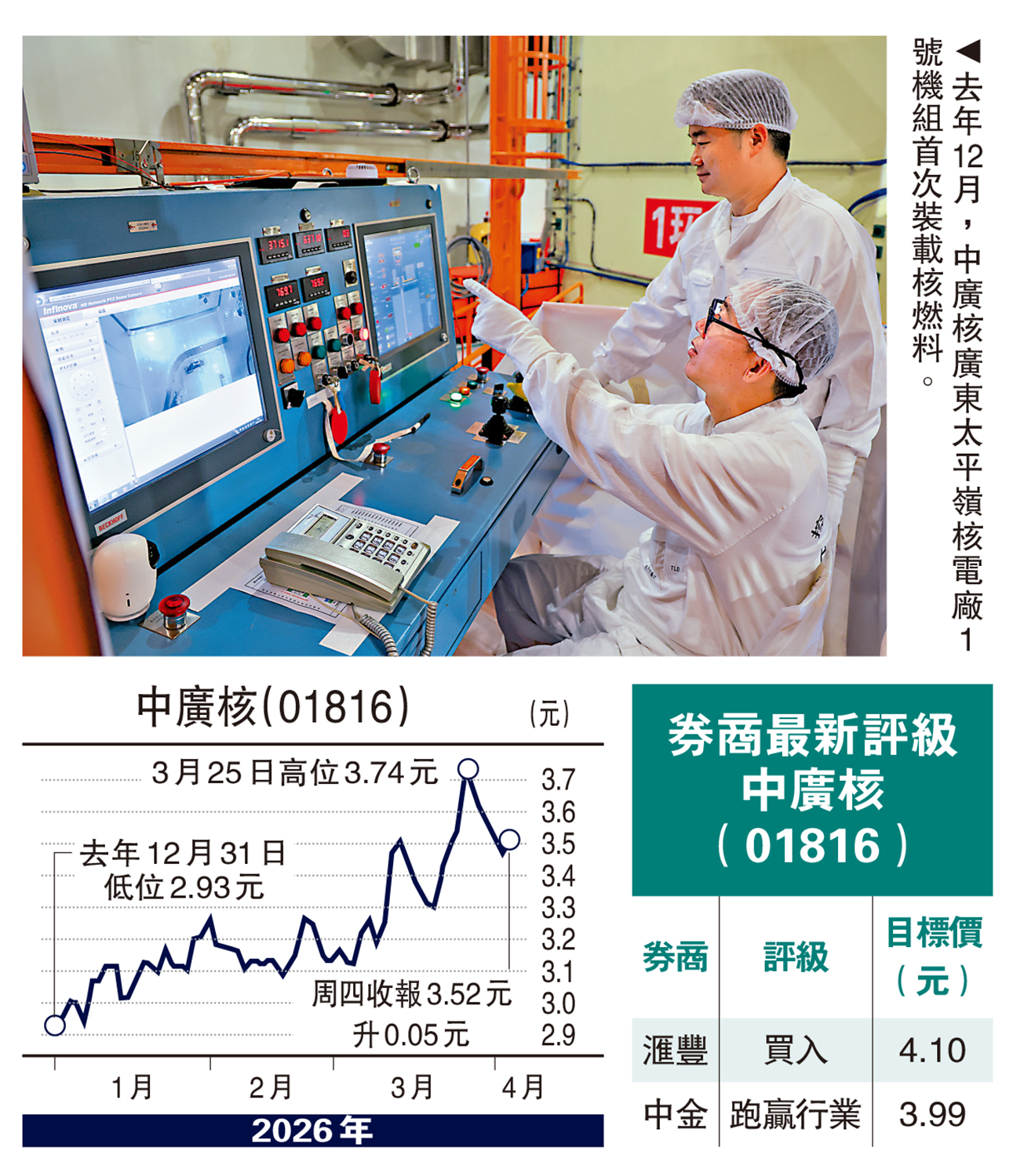 香港股票分析師協會主席鄧聲興表示,去年中廣核運營表現穩健,全年總發電量同比增長2%至2470億度,總上網電量同比增長2.36%至2326億度,符合市場預期。此外,公司持續推進在建項目進度,惠州核電股權交割已完成,惠州1號及2號機組(各120萬千瓦)有望於今年4月及11月投產,公司持股82%對應約4億元人民幣盈利增量。控股股東委託管理的蒼南1號機組亦計劃於今年投產。截至去年年底,集團共管理20台在建機組,為「十五五」期間業績穩步向上提供堅實支撐。