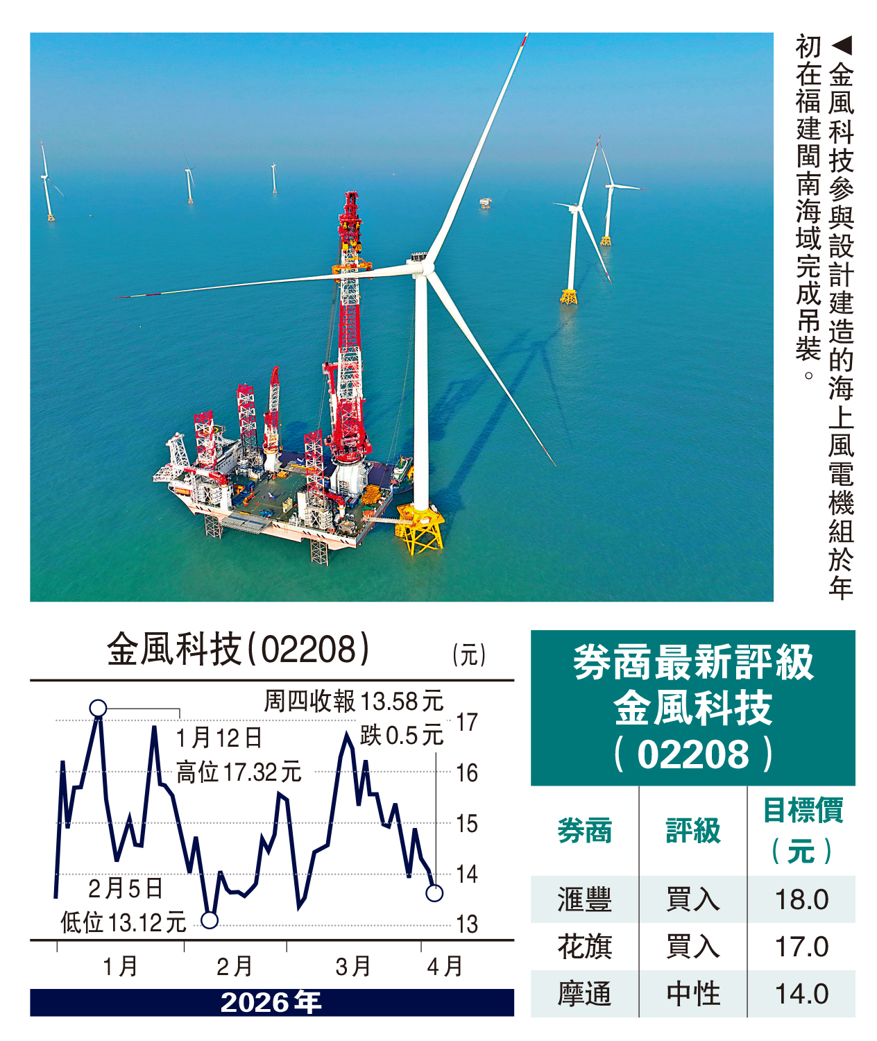 摩根士丹利則表示,在國家能源轉型目標及在岸風電設備更換的支持下,預計本土裝機需求保持平穩,尤其看好設備供應商的利潤率。該行又看好中國風電設備對歐洲市場出口的表現,並維持對「十五五」規劃期間,中國風電裝機量正面看法。該行維持對金風科技「與大市同步」評級,相信風力發電機組業務扭虧的利好已大致反映。