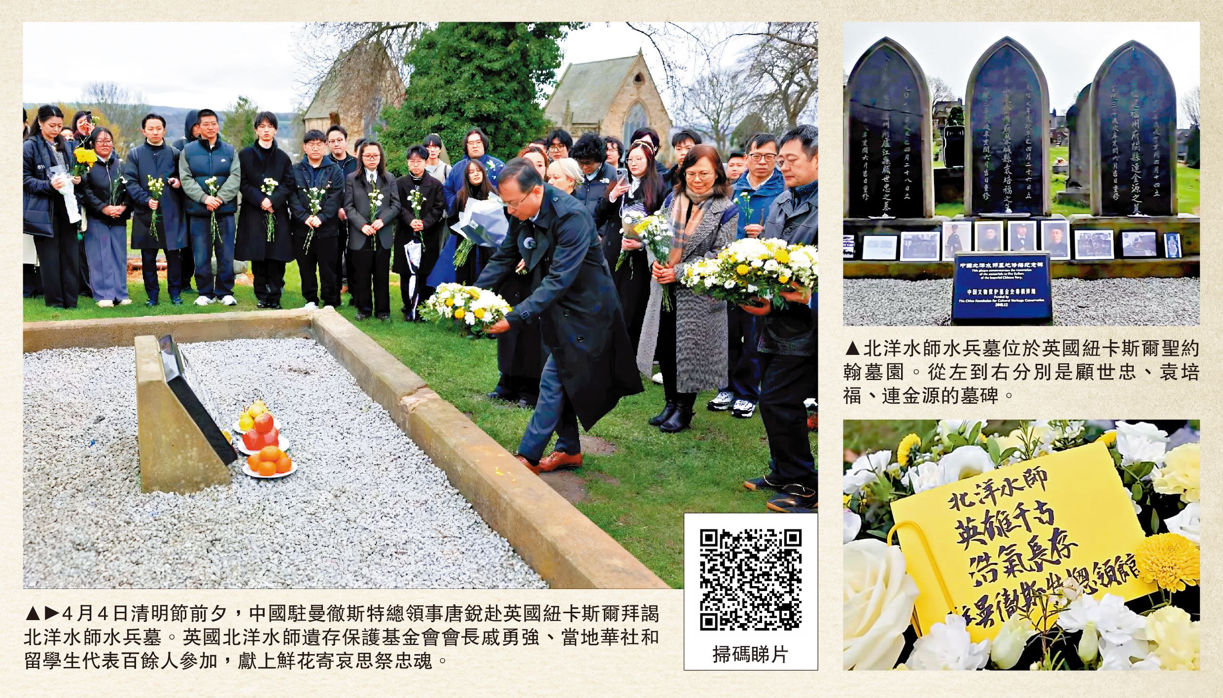 清明時節寄哀思,萬里之外祭忠魂。日前,中國駐多國使館等舉行祭掃活動,祭奠長眠海外的英烈。4月4日清明節前夕,中國駐曼徹斯特總領事唐銳赴英國紐卡斯爾拜謁北洋水師水兵墓。英國北洋水師遺存保護基金會會長戚勇強、當地華社和留學生代表百餘人參加。