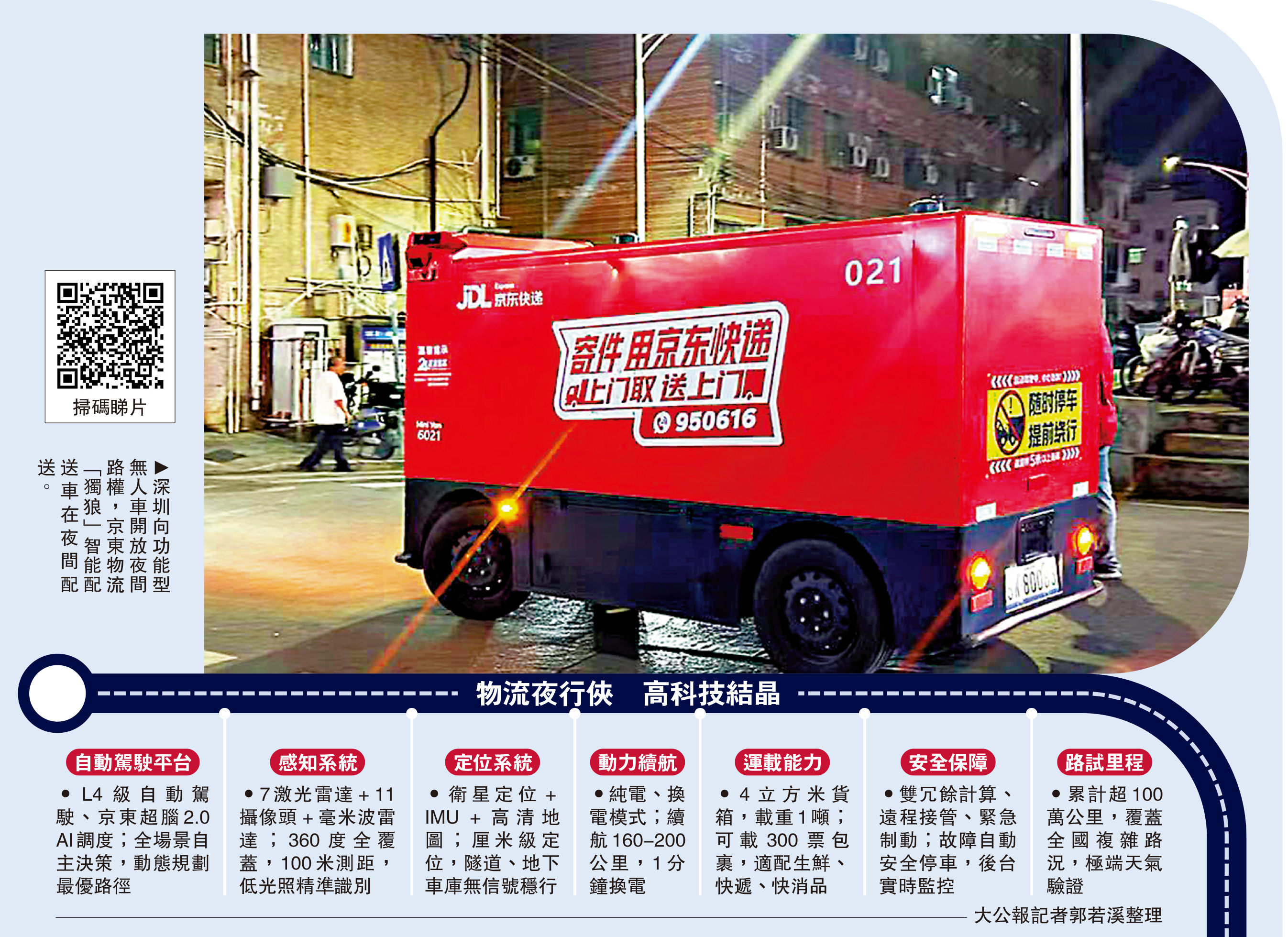 據測算,夜間運營可提升30%以上的運力效率,同時人力也得以釋放。目前京東物流無人車已完成超百萬公里的道路測試,其搭載的多傳感器融合感知系統,在低光照下依然能精準識別道路標線、紅綠燈和障礙物。開放夜間路權標誌着深圳自動駕駛商業化從「日間末端配送」向「24小時全天候跨區協同」邁出了關鍵一步。\大公報記者 郭若溪深圳報道
