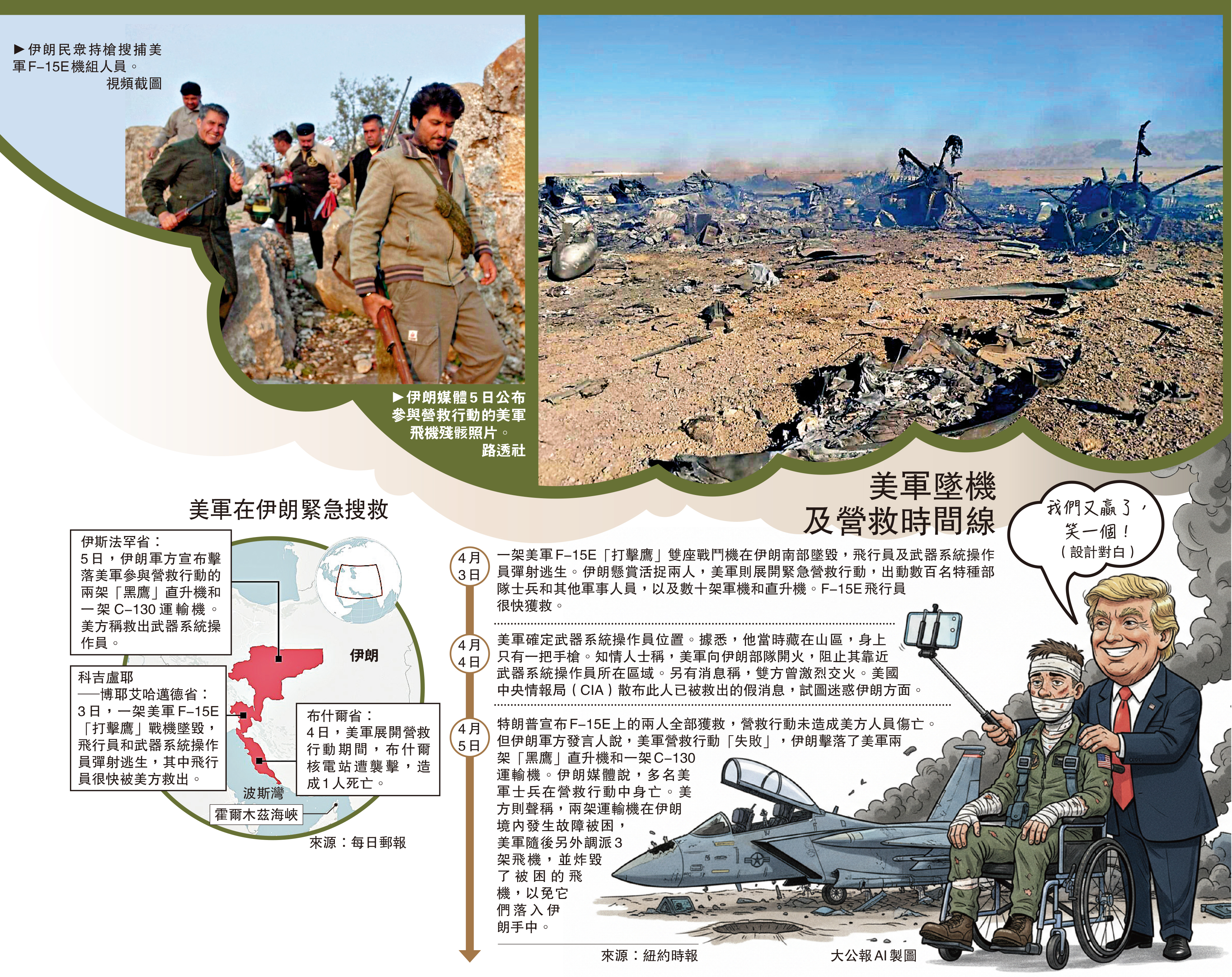 當地時間5日凌晨,美國總統特朗普宣布美軍已從伊朗救出被擊落F-15E「打擊鷹」雙座戰機上的武器系統操作員,至此機上兩人全部獲救。他吹噓美軍執行了「美國歷史上最大膽的搜救行動之一」,試圖將此次行動包裝成美方的勝利。而伊朗媒體則表示,美軍營救行動「徹底失敗」,參與行動的兩架直升機和一架運輸機被擊落,並且有多名美軍士兵身亡。伊朗議長卡利巴夫嘲諷說,如果美國再取得這樣的「勝利」,就將徹底毀滅。評論指,這一名落單武器系統操作員的搜救行動,已經成為美伊爭奪敘事權的新戰場。\大公報記者 郭嘉
