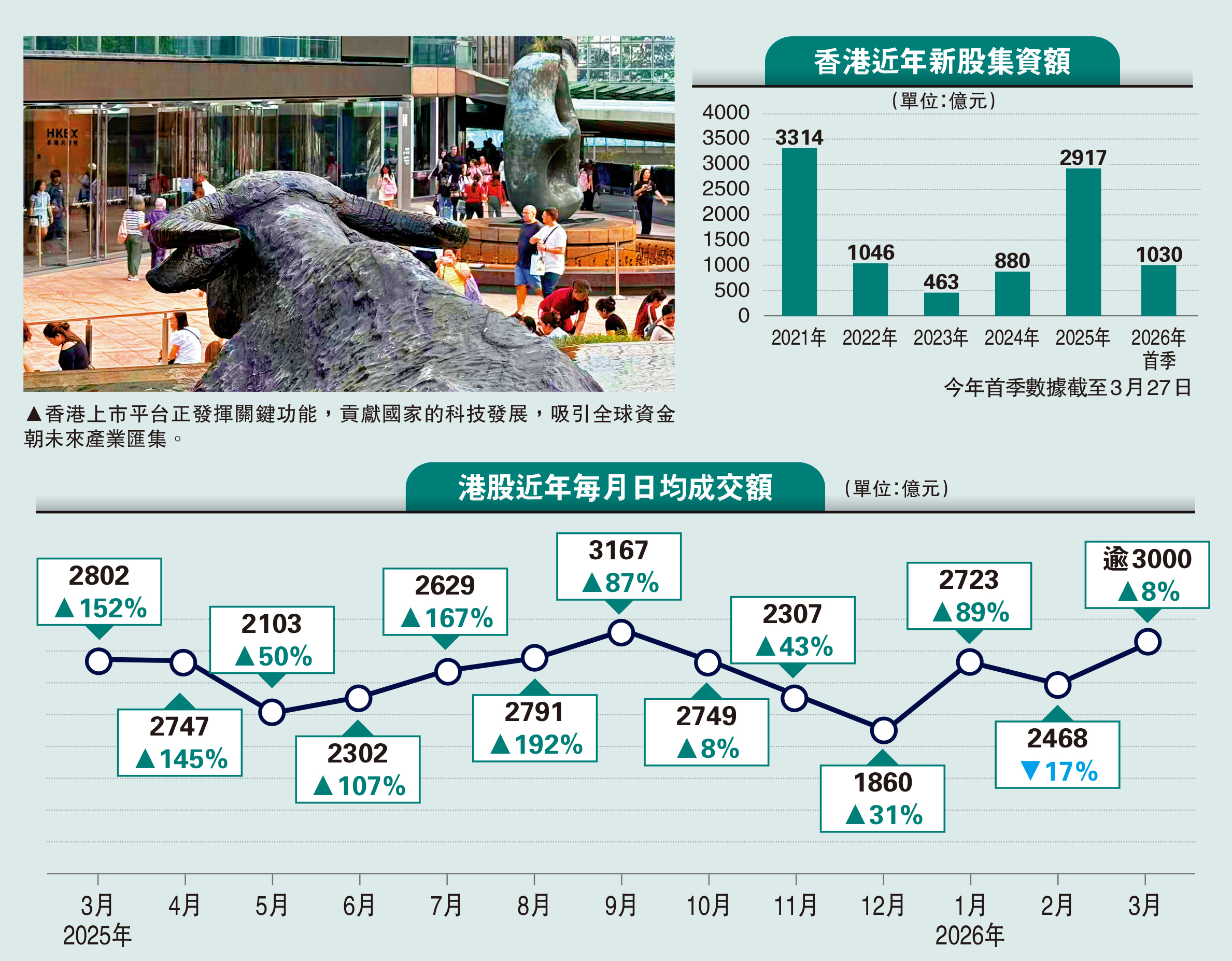 面對環球局勢複雜多變,香港繼續發揮資金避風港的重要角色。財政司司長陳茂波指出,首季本港股市持續活躍,IPO市場延續去年強勢,實體經濟整體亦見改善。首季IPO集資規模逾1030億元,稱冠全球;3月份港股日均成交逾3000億元,按年增長逾8%;正在輪候的上市公司超過500宗,反映資金在港配置需求大,香港作為企業融資與「出海」的窗口地位穩固。\大公報記者 李潔儀