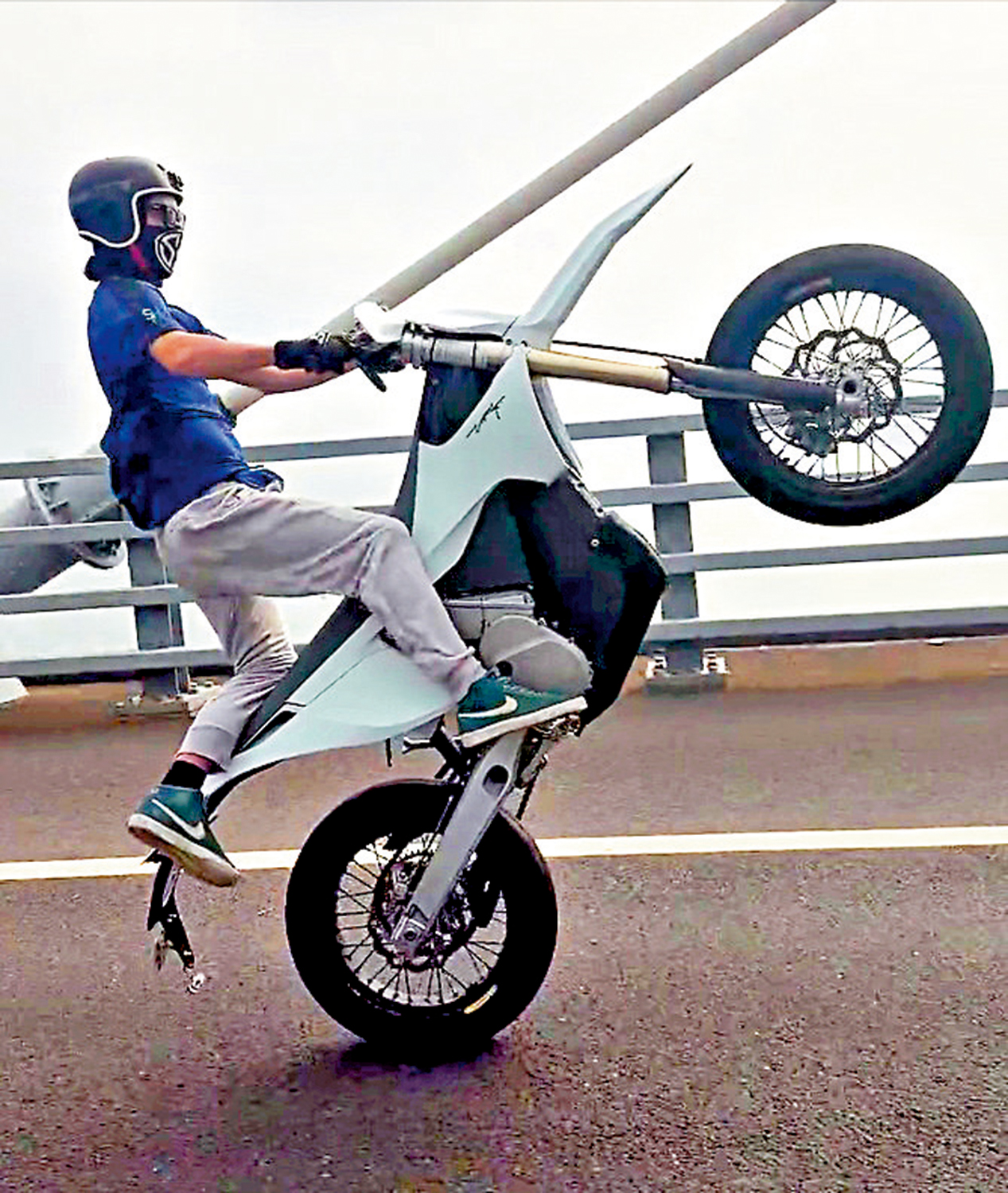 【大公報訊】記者姚棠報道:一名擁有4.7萬IG粉絲的英籍電單車網紅為了拍片,近日在昂船洲大橋騎電單車時罔顧安全,抬起前輪做出特技動作高速行駛(見圖),翌日又上載一段在青沙公路行駛短片,因為電單車後面車牌脫甩,被交通警員截查。警方表示,截查後發現他涉嫌懷疑危險駕駛行為,正在調查事件。