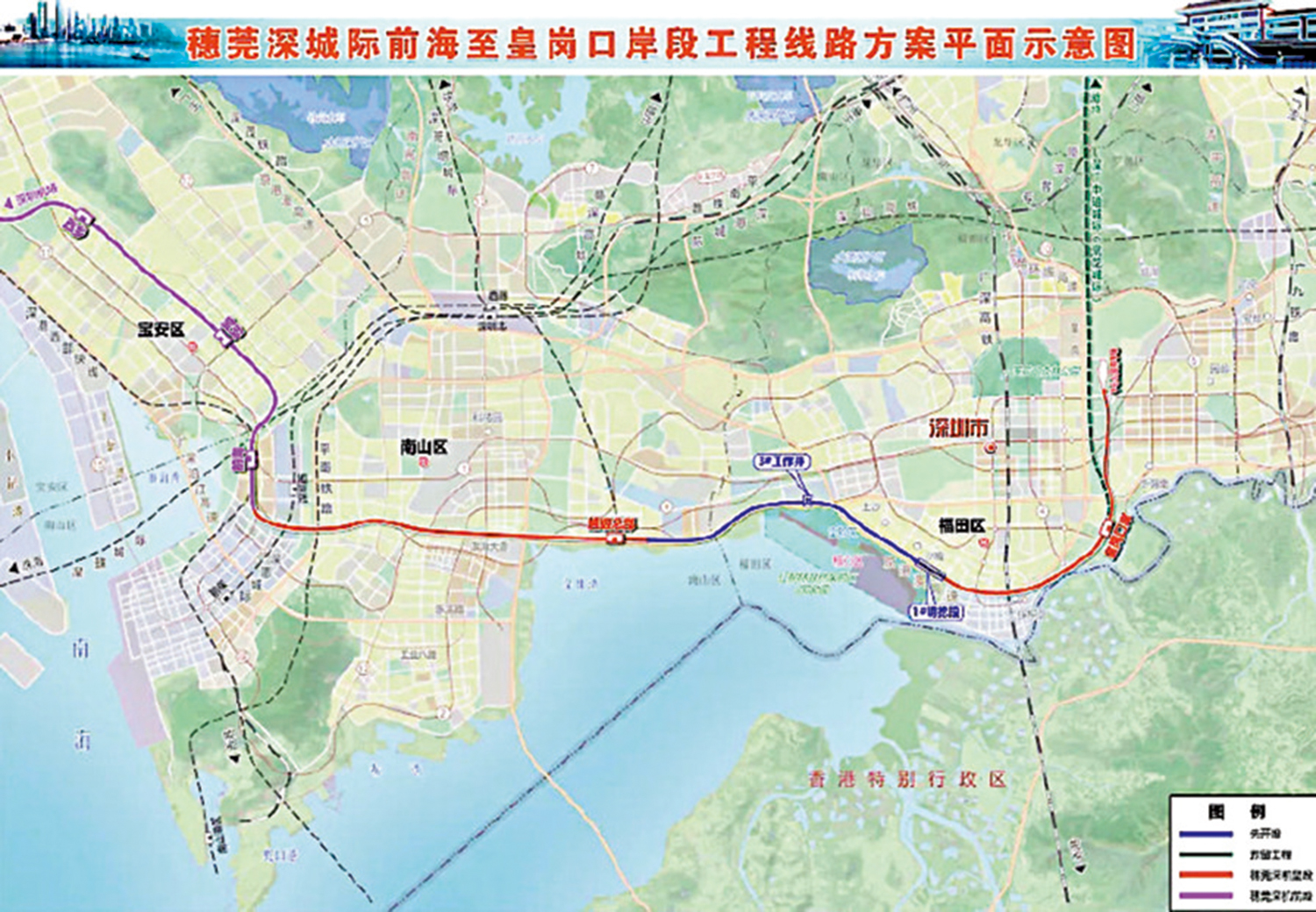 前海至皇崗口岸段(前皇段)將設超級總部站、皇崗口岸站2座地下站及中心公園存車場,設計時速160公里,建成後可與多條深圳地鐵換乘,強化前海與深圳核心區聯繫,還將聯動規劃中的港深西部鐵路,實現香港北部都會區與前海、南沙直連,促進大灣區人流、物流、資金流、技術流高效流通。