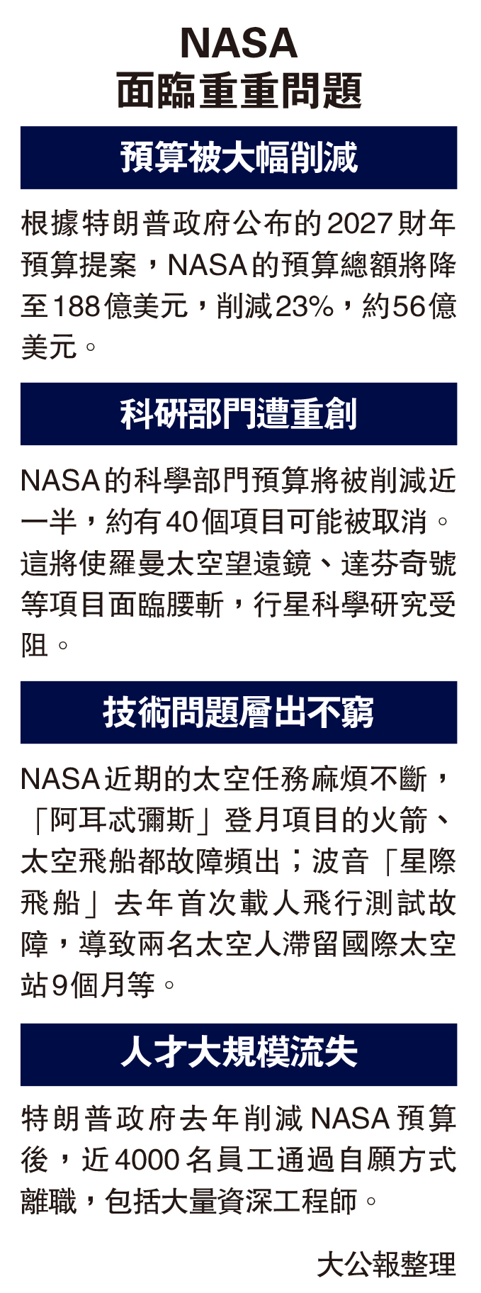 特朗普政府去年削減NASA預算後,近4000名員工通過自願方式離職,包括大量資深工程師。