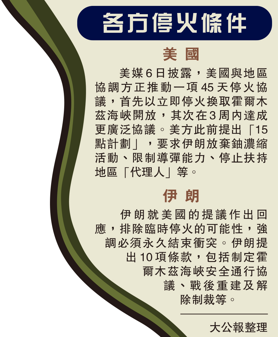 美媒6日披露,美國與地區協調方正推動一項45天停火協議,首先以立即停火換取霍爾木茲海峽開放,其次在3周內達成更廣泛協議。美方此前提出「15點計劃」,要求伊朗放棄鈾濃縮活動、限制導彈能力、停止扶持地區「代理人」等。