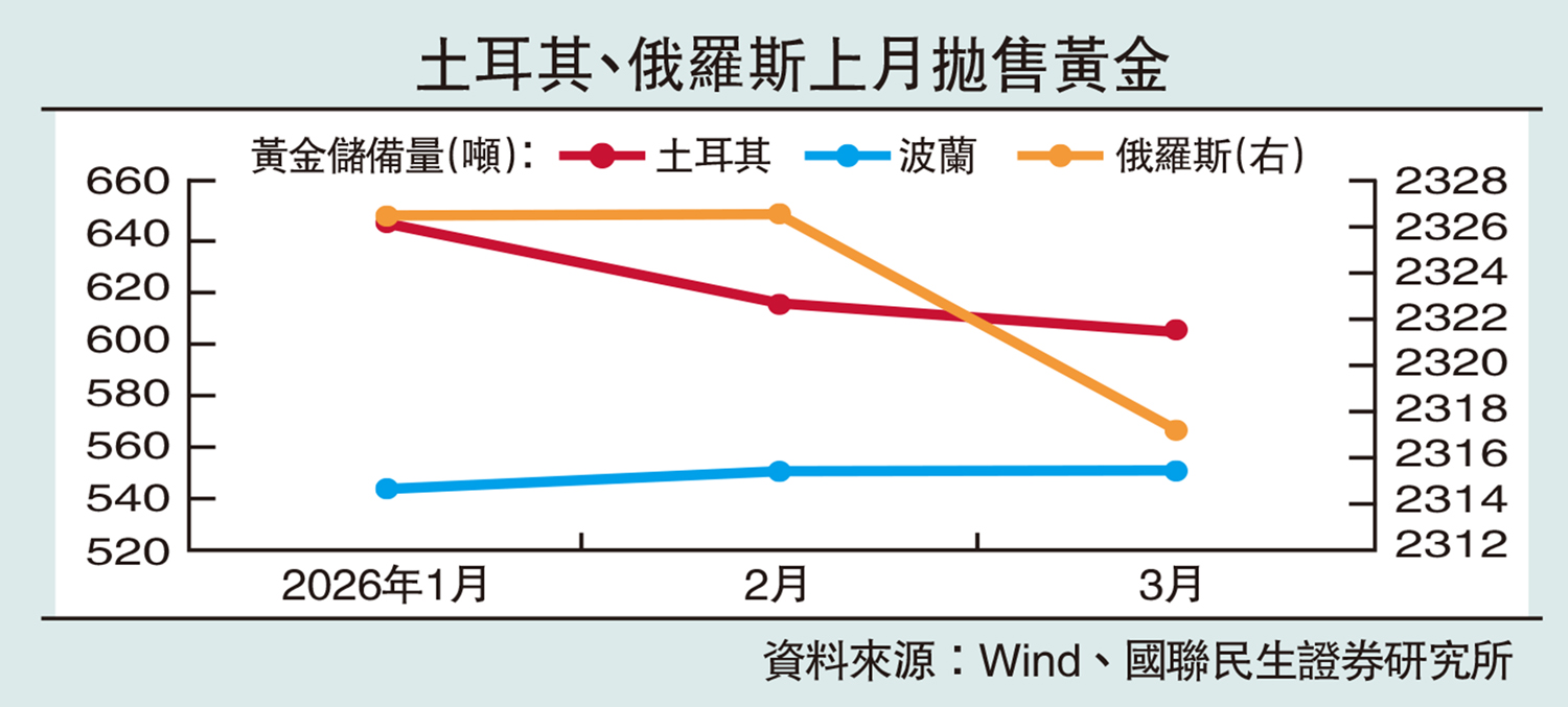 美伊衝突爆發以來,市場對部分國家拋售黃金頗為關注,對「央行購金」支撐的黃金牛市邏輯初現質疑。如配圖所示,2026年3月土耳其、俄羅斯央行已經開始拋售黃金,波蘭則計劃拋售黃金以支持國防建設。