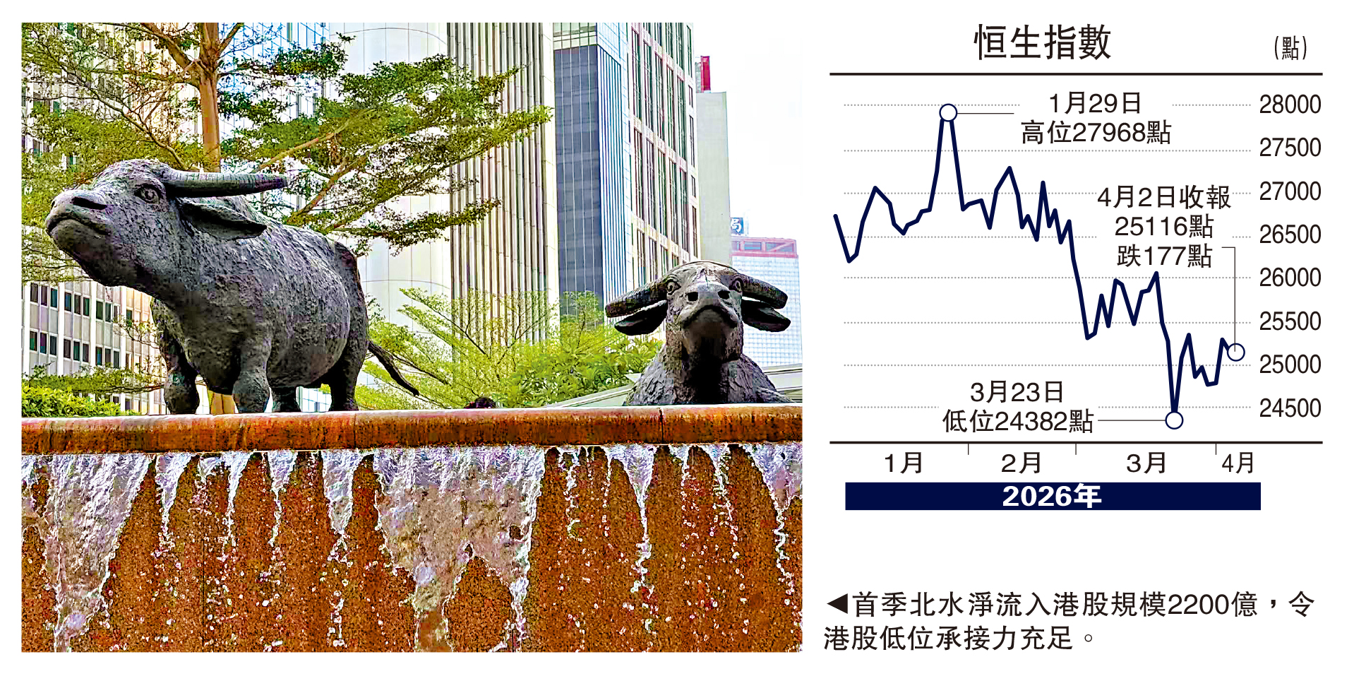 一,北水南下買港股意欲保持高漲。內地存款利率走低的背景下,今年北水淨流入港股規模增加,迄今超過2200億(港元,下同),相當於去年全年的16%。今年1至2月淨買入港股分別為617億及803億元,而3月亦有約800億資金淨流入港股,可見首季北水南下令港股低位承接力充足。