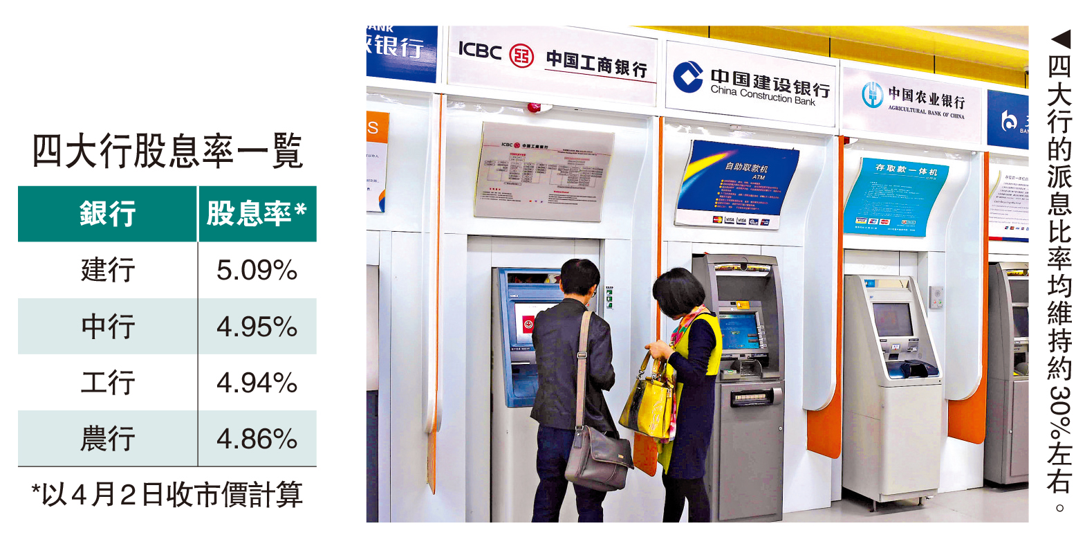 四大行的派息率均維持約30%左右,以4月2日收市價計算,四大內銀股股息率均有約5厘,市場亦普遍預測其2026年股息率會在5厘以上。分析認為,內銀股最大賣點不在高增長,而在盈利與派息可預期,加上國有大行資本實力雄厚,現金分紅政策延續性仍較高,令板塊在市況波動、資金偏好防守性資產時,繼續成為高息資金停泊對象。