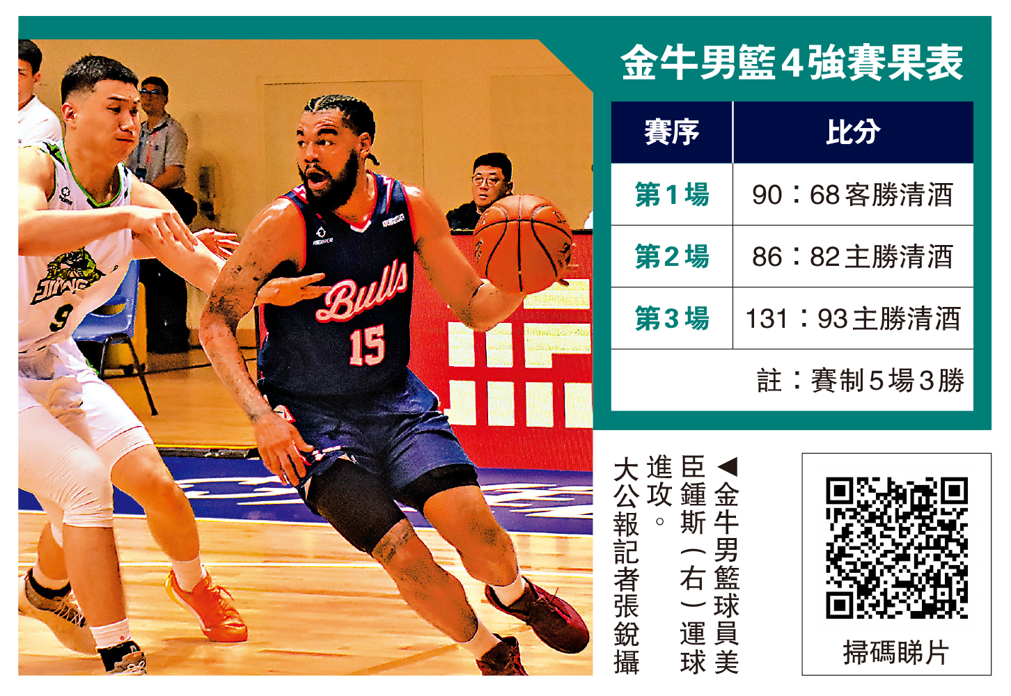 【大公報訊】記者張銳報道:全國男子籃球聯賽(NBL)7日晚上舉行4強賽第3回合,賽前大比分領先2:0的香港金牛續在主場的荃灣體育館對陣江西鯨裕清酒。最終實力強勁的金牛以131:93輕勝,在5場3勝制下以3:0完勝,連續3屆打入總決賽,力爭總冠軍3連霸。