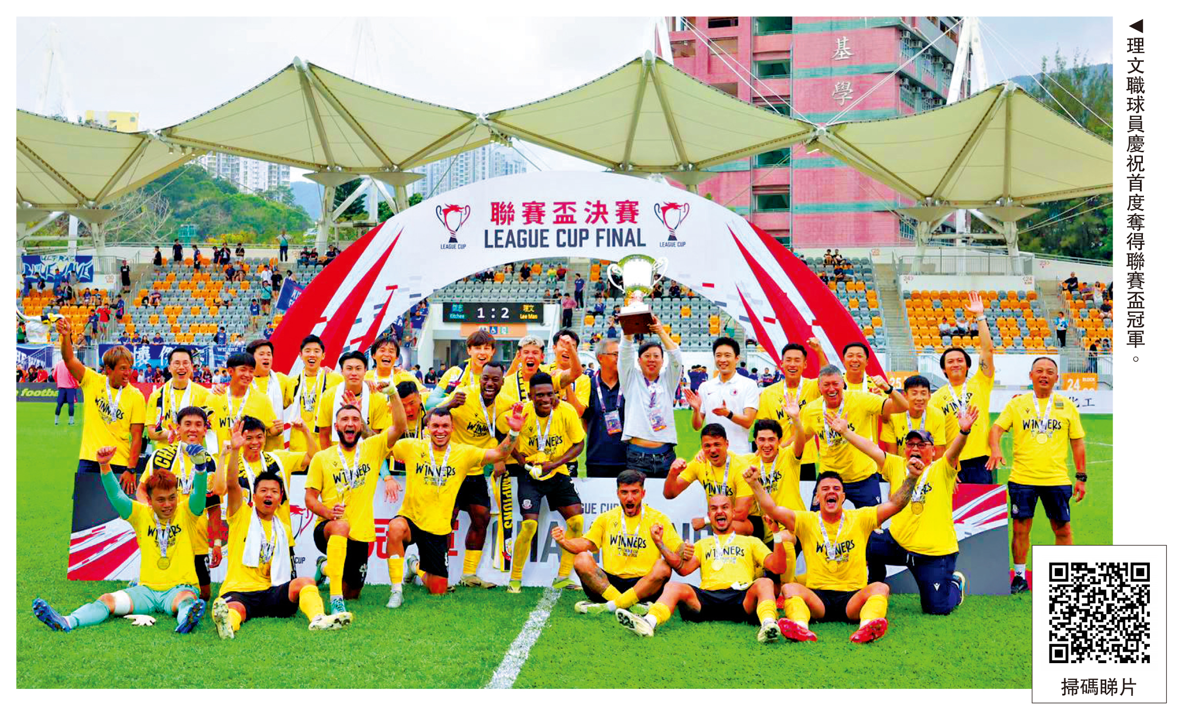 本地足球賽事聯賽盃決賽7日在旺角大球場上演,由理文對陣傑志爭冠。在3770名入場球迷見證下,雖然理文一度處於下風,但在下半場憑着艾華頓、巴科爾兩名鋒將先後破門,最終以2:1擊敗傑志,奪得隊史首座聯賽盃冠軍。理文班主李文恩表示,奪冠當然值得慶祝,目前正在考察新任主教練,希望他在下季能為球迷帶來新鮮感及提升球隊在細節上的處理,來季球隊將繼續力爭重奪聯賽錦標。\大公報記者 朱家立(文、圖)