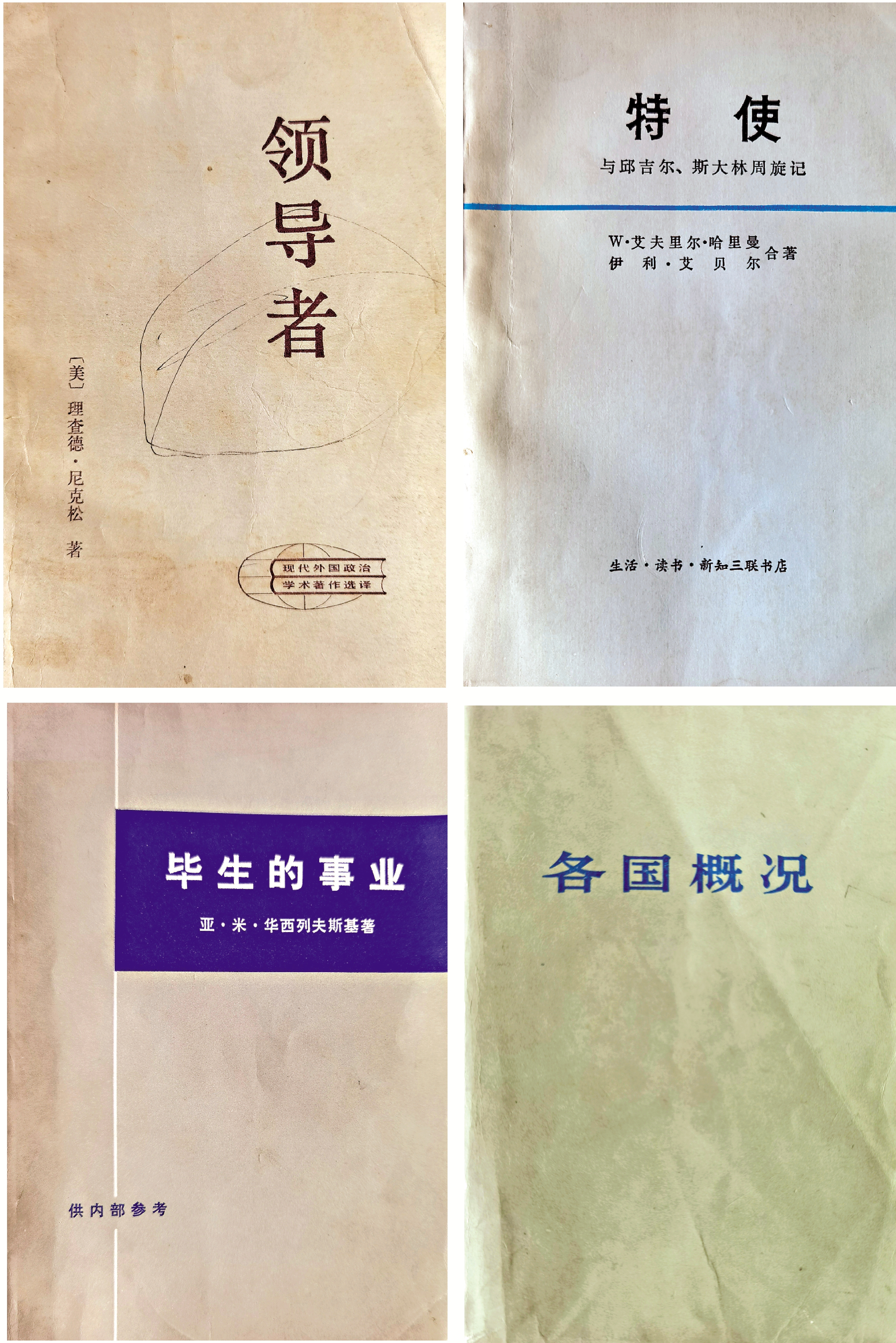 這個偶然發現,倒促使我萌生了一個想法:何不把分散各處的「內部版」圖書匯攏起來呢?於是,我先回深圳把書櫃中凡出版於七八十年代的舊書都查驗了一遍,遺憾的是,滿滿當當一屋子書,只有一套《各國概況》。而來到天津舊宅就不同了,在僅存的一個書櫃裏就找出了四本,除了《領導者》,還有一九七六年上海人民出版社的《跛足巨人》、一九七八年三聯書店出版的《特使》和一九七九年遼寧人民出版社的《遠東的勝利》。再回到北京的書房,舊書雖然不少,但年份顯然更早一些,標記「內部發行」的書,只翻出一套《畢生的事業》(上下冊),是三聯書店一九七七年出版的。把這些同屬於五十年前的「內部版」圖書聚到一起,立即發現了其鮮明的時代特點:均屬政治軍事類,均屬彼時最新的外國資訊和學術成果,大多涉及美國和蘇聯這兩大政治軍事集團……由此可見,這些書在當年該是何等時髦、何等風光!