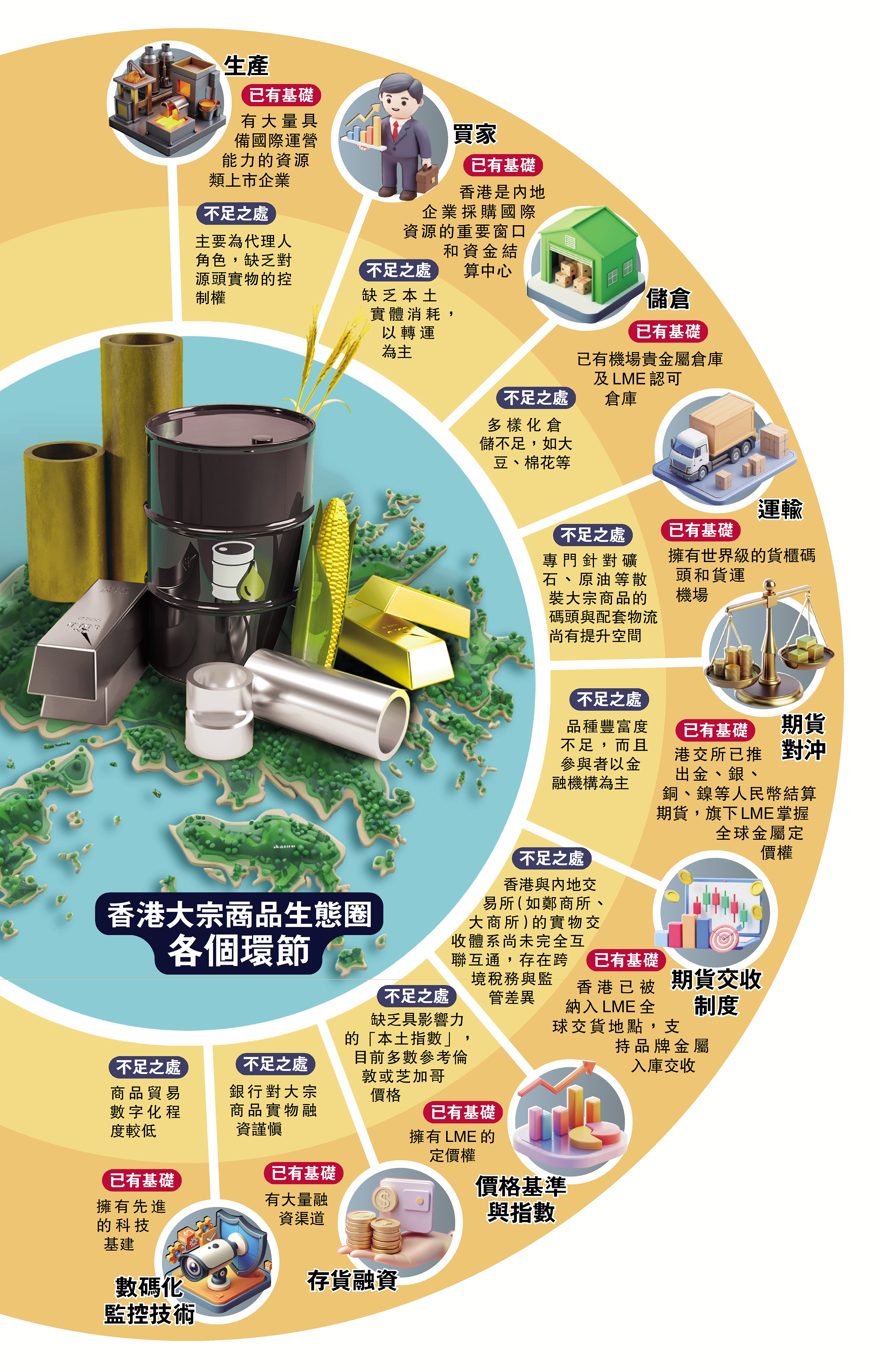 另外,「商品通」是市場十分關注的其中一個環節,去年香港明天更好基金的研究報告建議,可複製「深港通」、「滬港通」模式來打造「商品通」,通過連結LME來接通內地與國際大宗商品市場的定價,並允許國企及央企在香港進行交易。目前不同業界人士也期待「商品通」的出現。